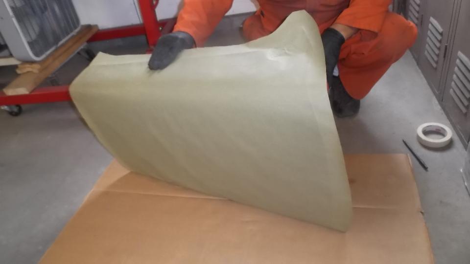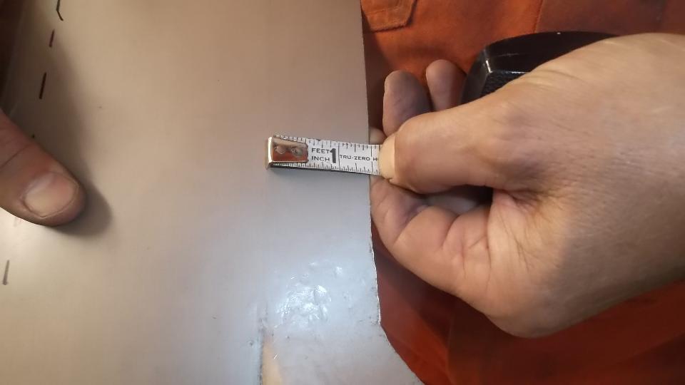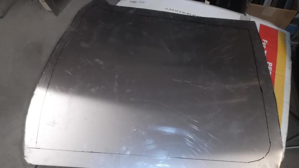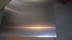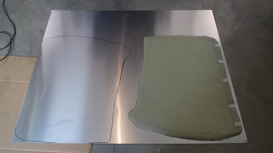 Tape the paper template at bottom of door, and wrap it securely around the outside surface. Then trace around the door again to have a more accurate perimeter line on the template. Align the paper on the new aluminum sheet, tape it down, and trace around the edge. That will be the cutting line for the rough blank before forming.