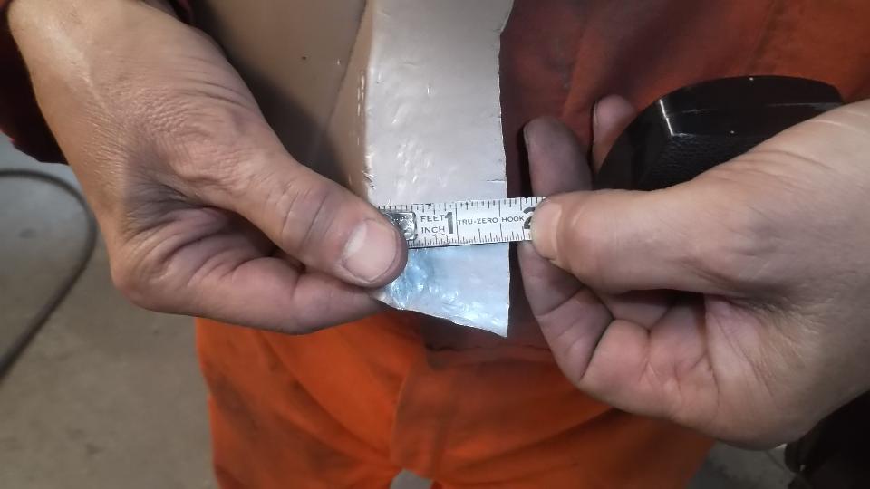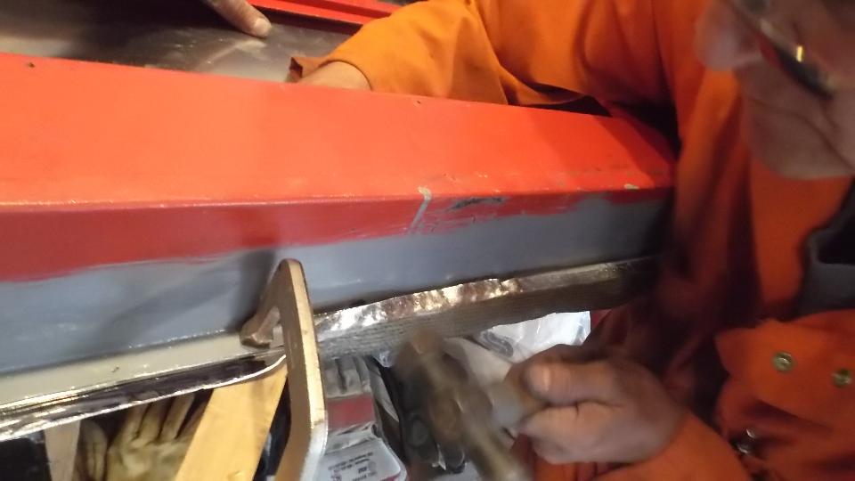Once the top edge and shoulder fit to our satisfaction and the side was fitting quite well, the first guesstimate position line was washed off. Bolts with large flat washers were installed on the top edge to secure the skin so it could no longer move. Then a line was scribed on inside of the skin around the shell where the fold-over bend needed to be formed. Dividers were used to measure and scribe an offset line for width of the flange that would be rolled over. Excess material was then trimmed from the edge of the skin to leave the final size before rolling the flange.