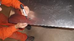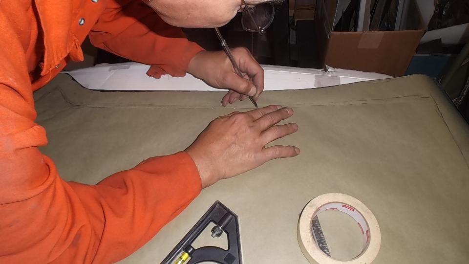 Reapply the paper template in alignment with the crease in the top corner. Scribe through the paper marking the door perimeter line on the metal. Then remove the paper and connect the marks to draw the door profile on the alloy sheet stock. This is mostly for reference at this point, not necessarily the final bend line for flanges.