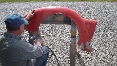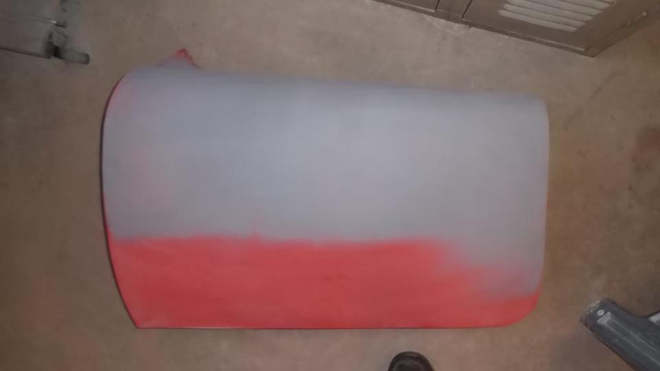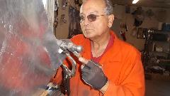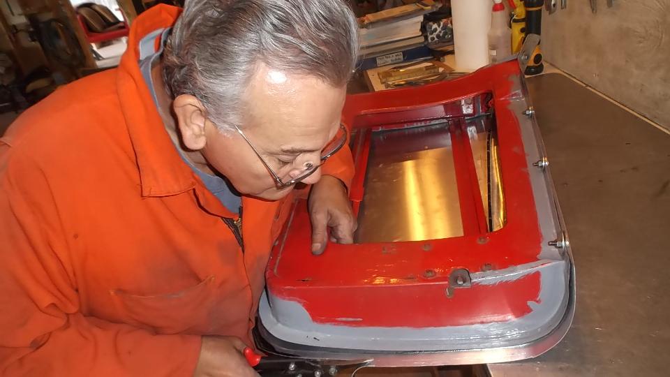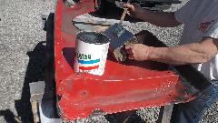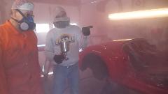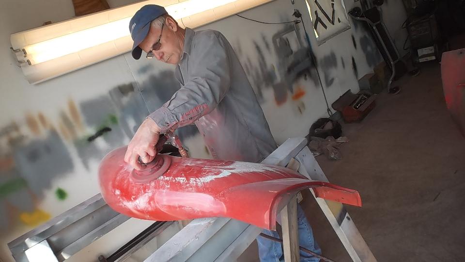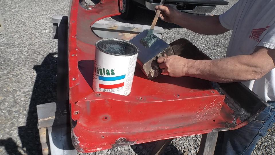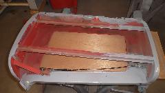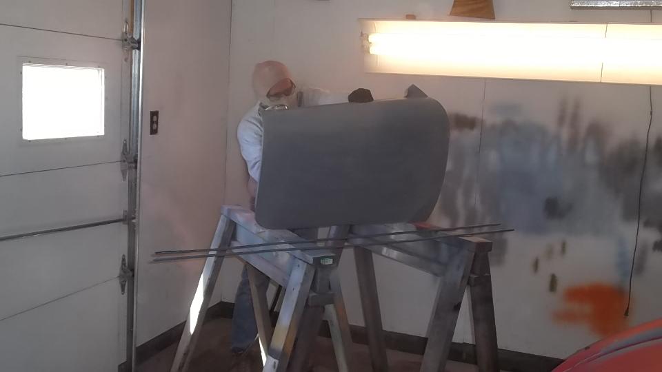 Then it was time for equipment clean up, and get out of the breathing apparatus and out of the shop for a mid afternoon lunch break. Later in the evening we were cleaning and sanding and painting the Fiberglas front valance panel, and the radio blanking plate (which had erroneously been black for the past 30 years. Of course there were a few smiles at day's end.