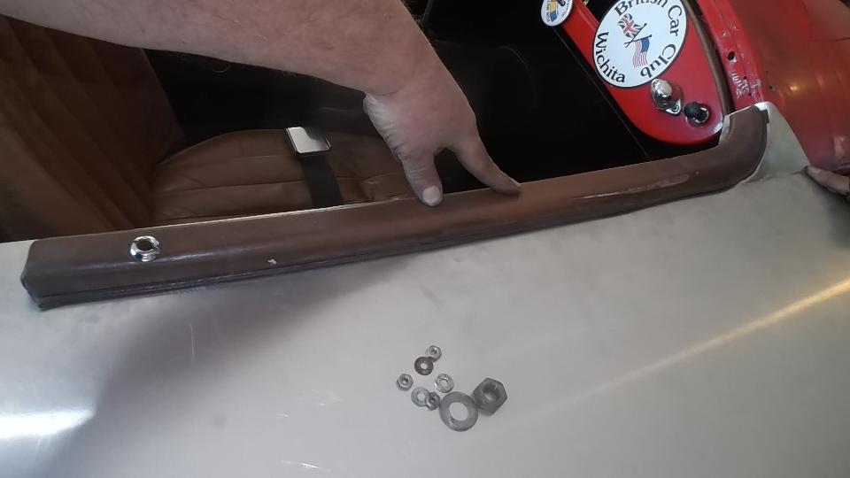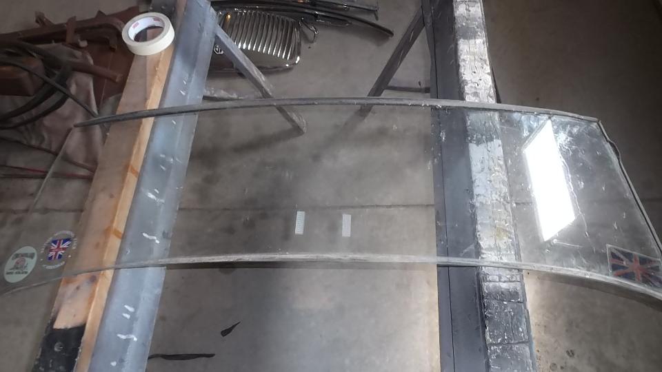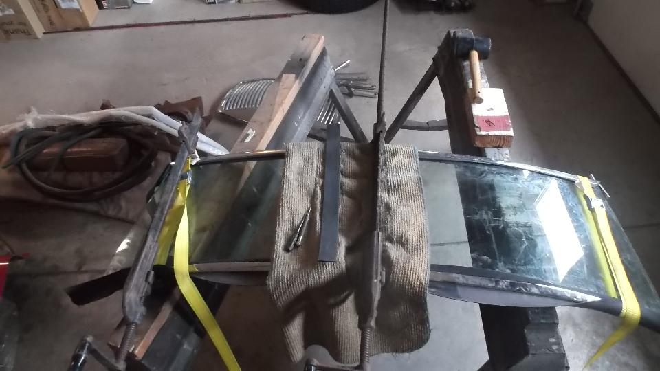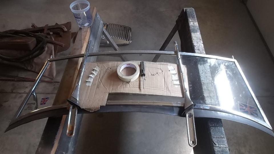 While Dave and Dick were prepping the car body (and I was staying away on request), I was into replacing glass in the MGA windscreen assembly. Done this a few times before, last time 14 years earlier, so I was hoping it would go well. For starters, all of the screws came out without much problem, as I stuck every screw on a map to be returned to the original locations.