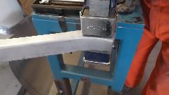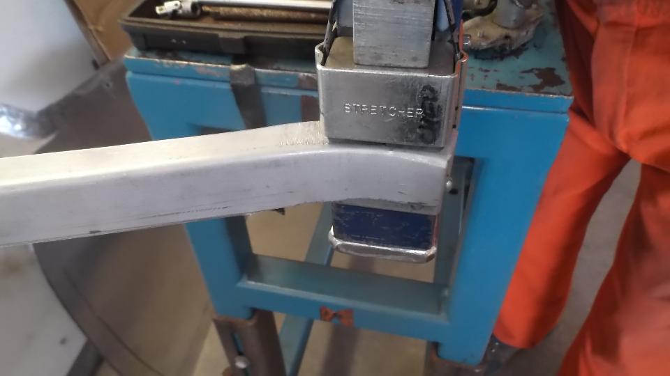 Meanwhile, Dave Cappa was working on the right side door shell, a bit of metal replacement. Use shear and press brake to form an angle piece from 18-gauge steel. Use the shrinker/stretcher to stretch one leg of the piece to make a curved end, and shortly there is a repair piece to fit.