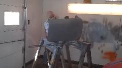 Mixing paint. Wetting down the floor after lots of sweeping. First paint applied inside of that new door skin.