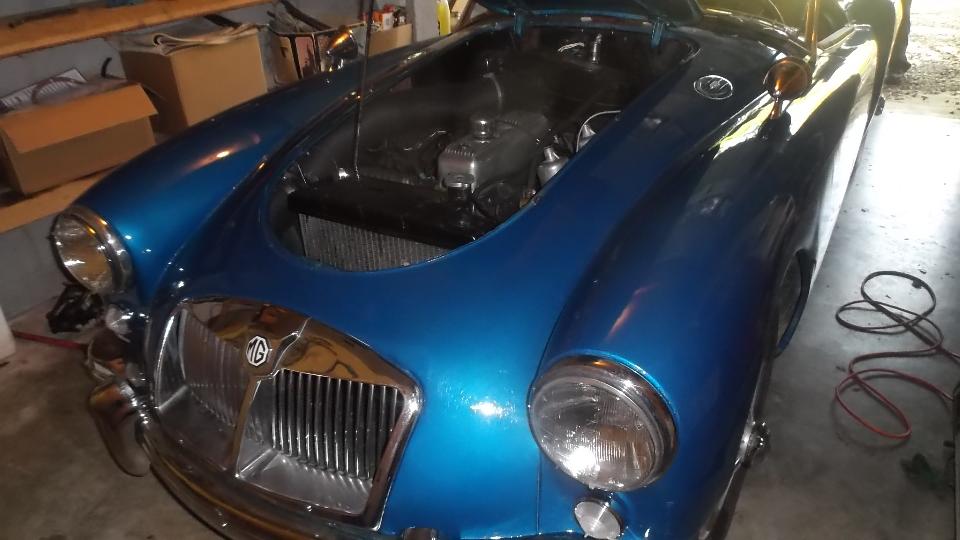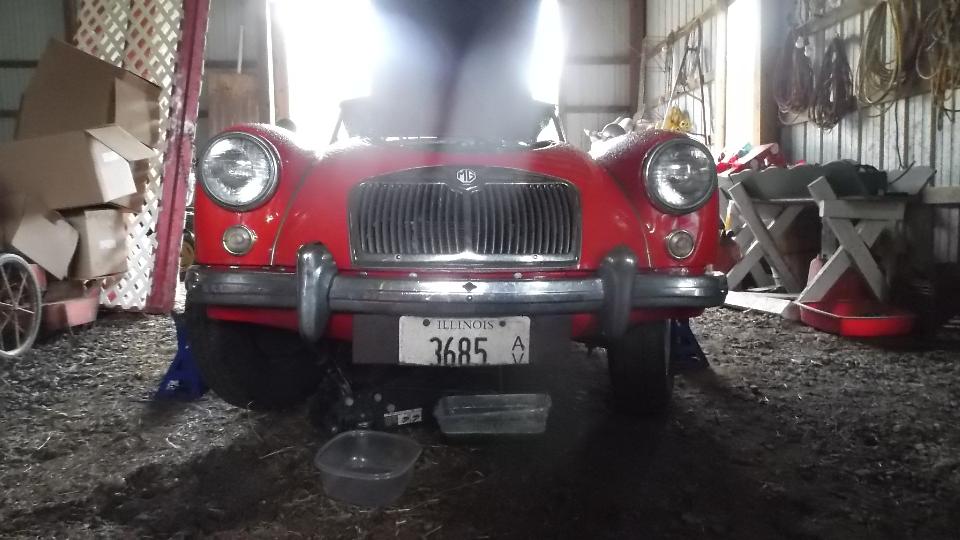 Ah, but the day was not done yet. As the hosts ran off for their evening appointment I grabbed navigator and we headed for the barn to do some maintenance on my MGA. Drain the radiator and yank it out to R&R the water pump. I was sure I had a couple of water pump gaskets in the trailer, but couldn't find them when needed, so I made a gasket. An hour later when looking for something else I found three water pump gaskets in my stash.
