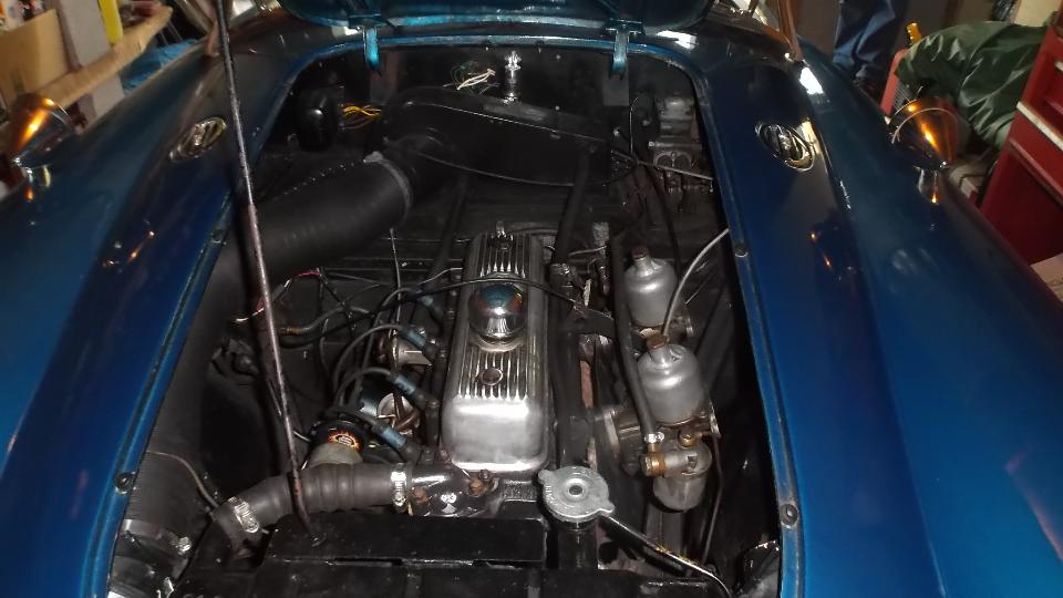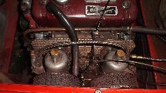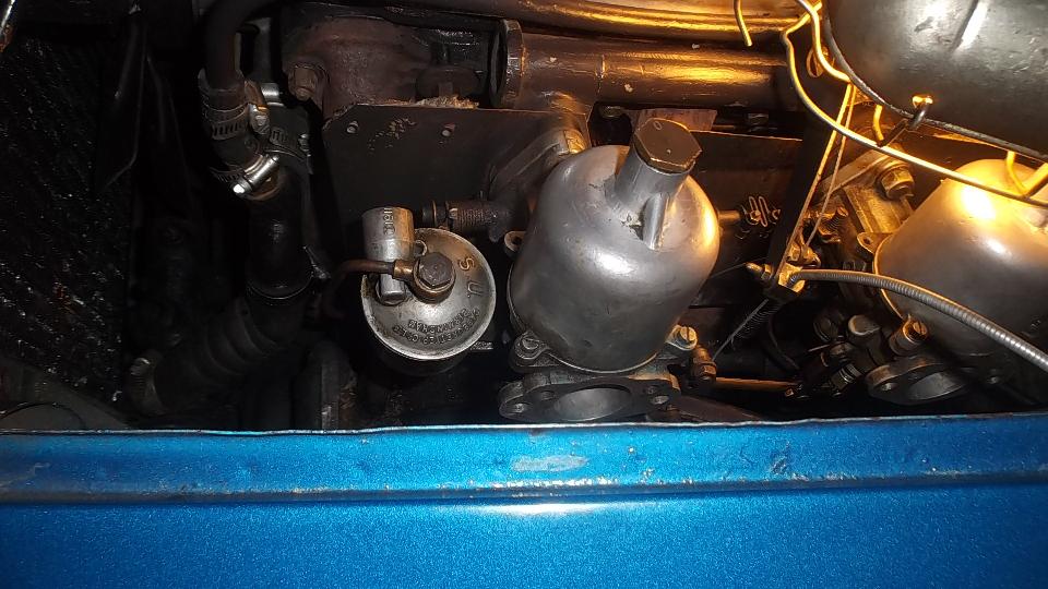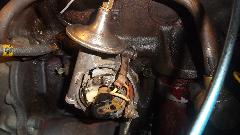 First diagnostic was an extremely weak spark on one cylinder only. Ignition coil was a Pertronics Flamethrower with 1.5 ohm resistance (big mistake). Removing distributor cap revealed points not opening, and badly worn rubbing block on the points. A quick points adjustment got it running in short order, but it was running very rich and dribbling fuel from both carburetors with jets stuck (full choke), and the distributor was cocked about 45 degrees clockwise. So the carbs were removed for disassembly, inspection, cleaning, adjustments to center the jets, and reassembly. Distributor drive gear was realigned to position the distributor in upright position. Sometime after dark the engine was purring and begging for a test drive, but maybe tomorrow by daylight.