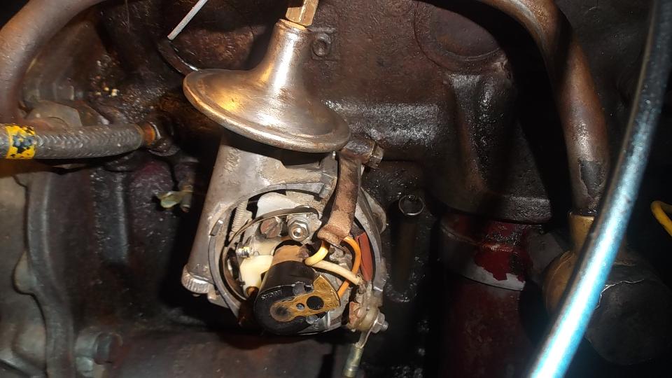 A little twist back of the stationary contact with pliers gave it some points gap, enough to fire it up and drive it home. Got to love these diminishing roads. Then Billy was off to town (in his pick-em-up truck) to buy a new 3-ohm ignition coil. New coil installed, and another new set of points had it purring again, but no time for another drive, as the hosts had other plans for the evening.