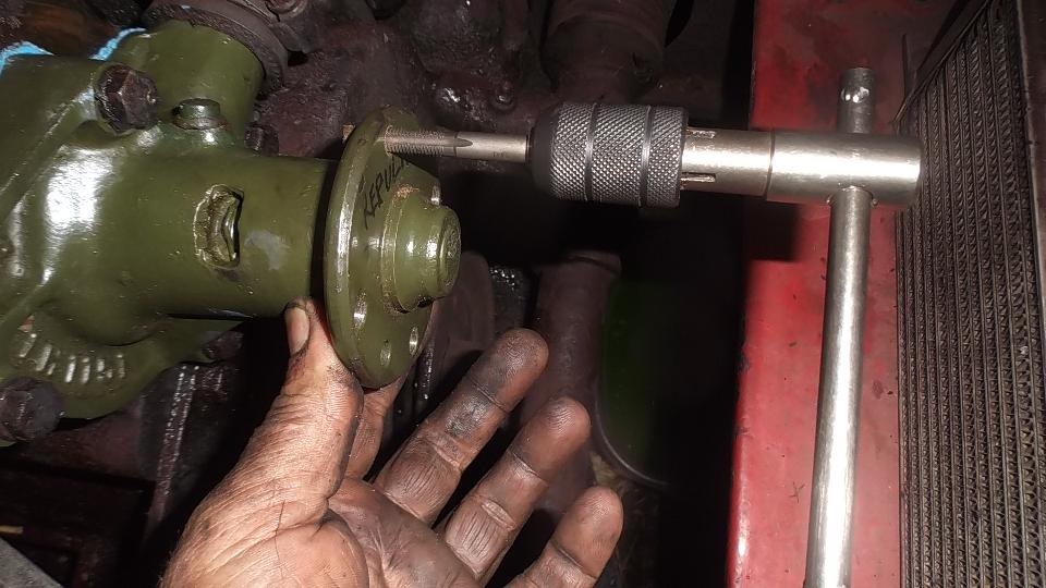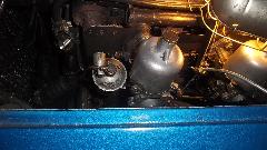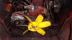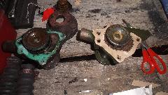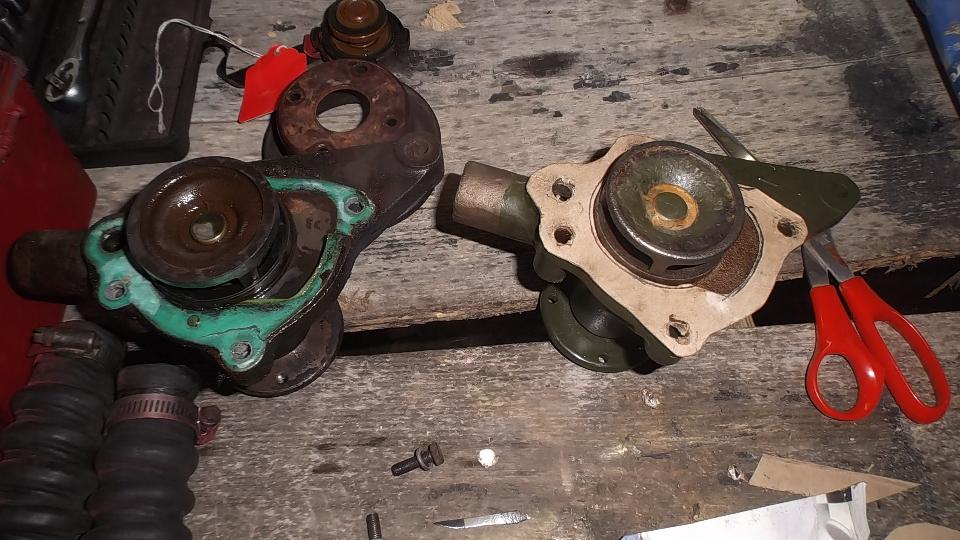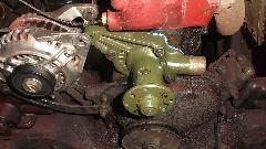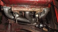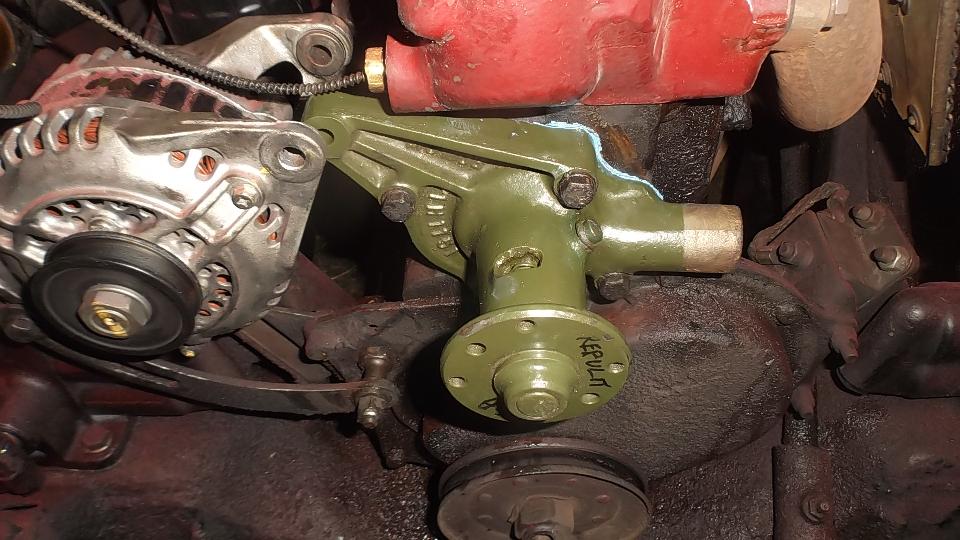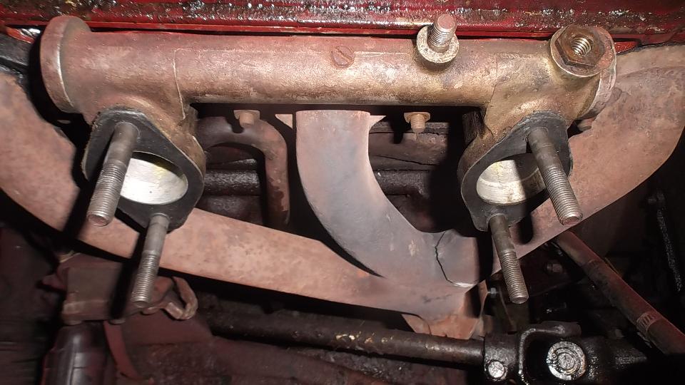 When the water pump was installed I had to clean paint out of the threads before attaching the pulley and fan. Then we were after the broken exhaust manifold, jack up to disconnect the bottom flange joint, remove carburetors and manifolds. This must be at least the fourth exhaust manifold failed on my car, all broken in the same place, and twice in the past two years.