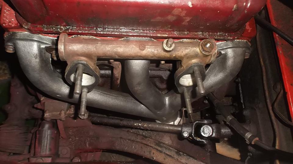 Having lost confidence in 50 year old heat cycled castings, I opted to buy a new one this time to see if it might last longer. Transfer threaded studs from bottom of old manifold to the new one, easy peasy since the studs were new last September. Shove it all back together in short order, and fire it up. Nice to banish the rattle and chuff-chuff in one swat. All quiet under the bonnet now.