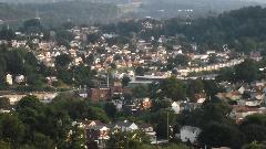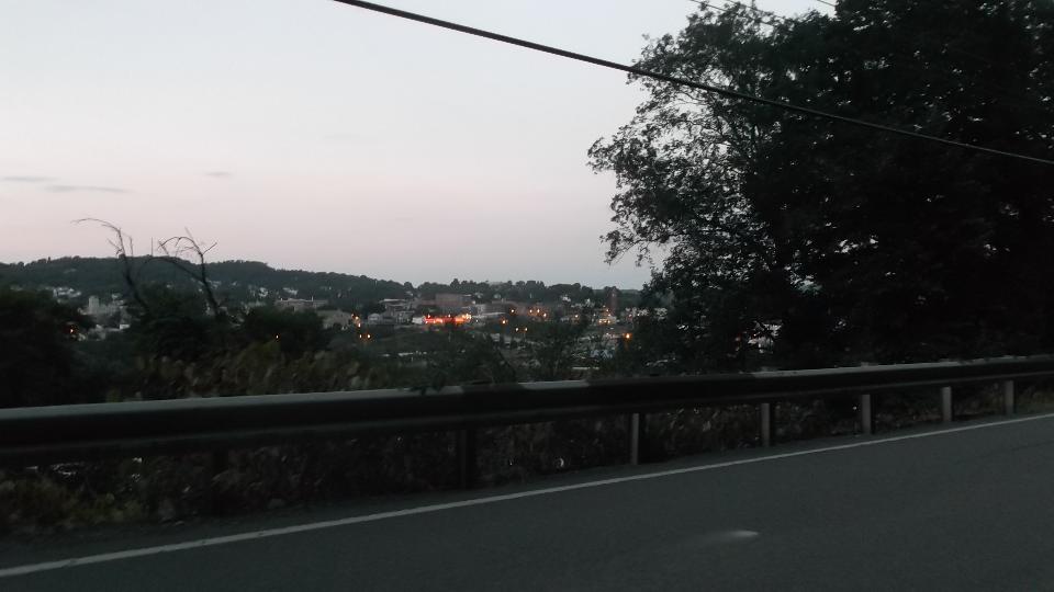 After catching up with a week end's worth of photos and notes we circumvent the city to the west. Aside from enjoyable driving, we find the Pennsylvania hills are good for the view as well. Get up high enough, and we can get a nice picture of the city. Somewhere along the way (in Moon Township PA) we make a stop at an auto parts store to buy a pair of cheap electric horns. We then continued farther north after dark, and spent the night in Butler, PA.