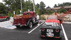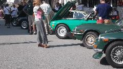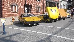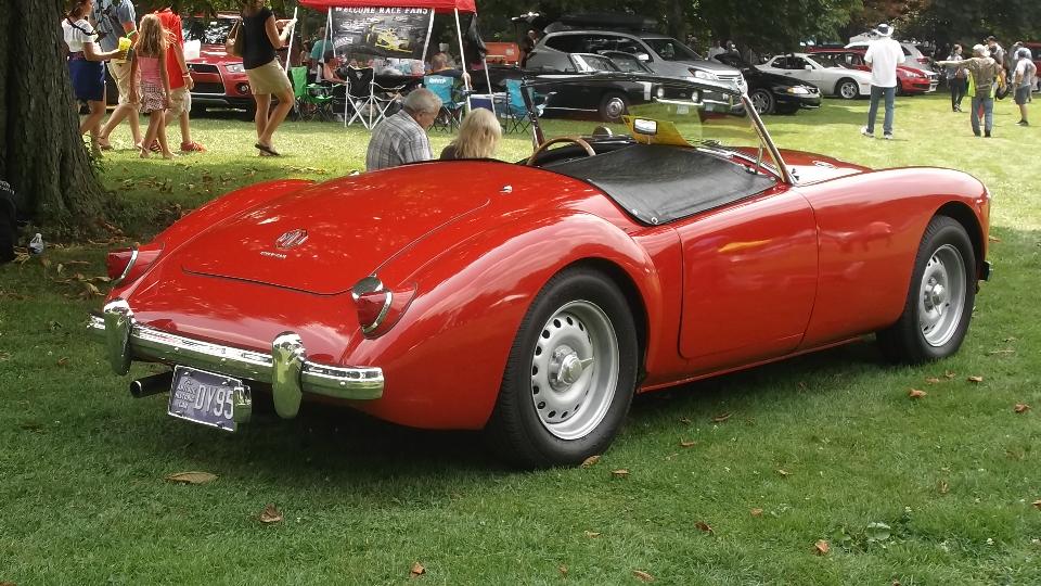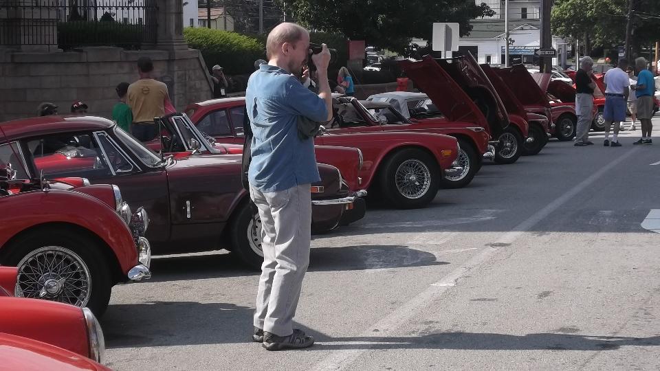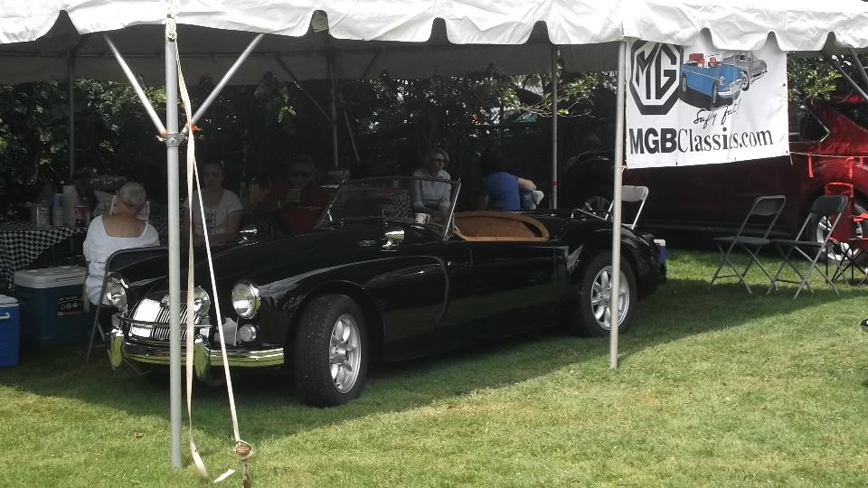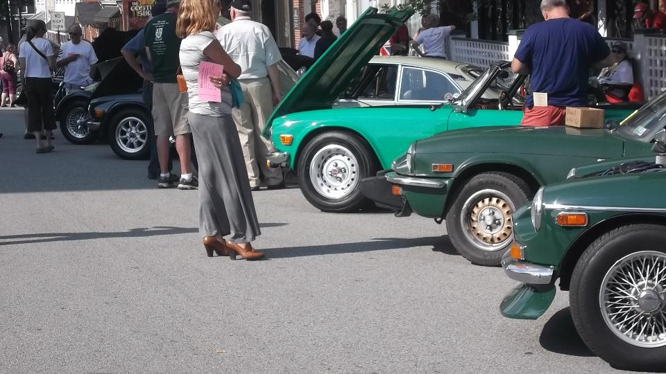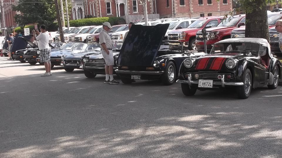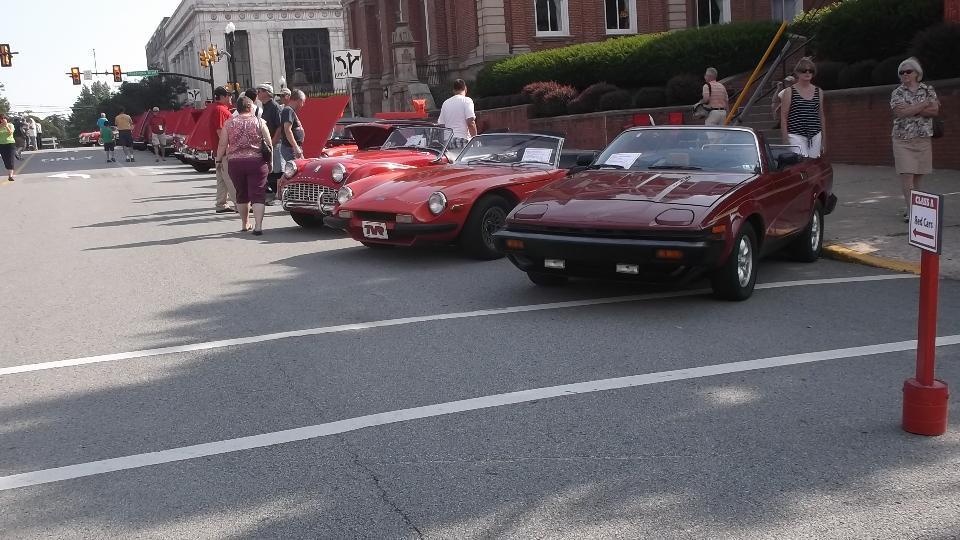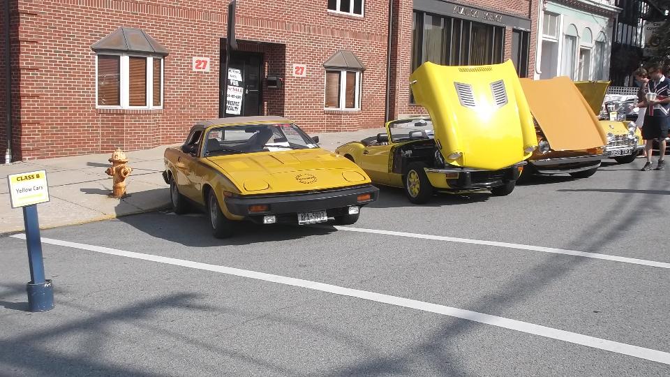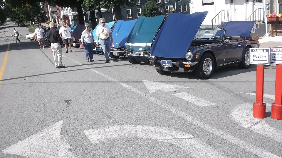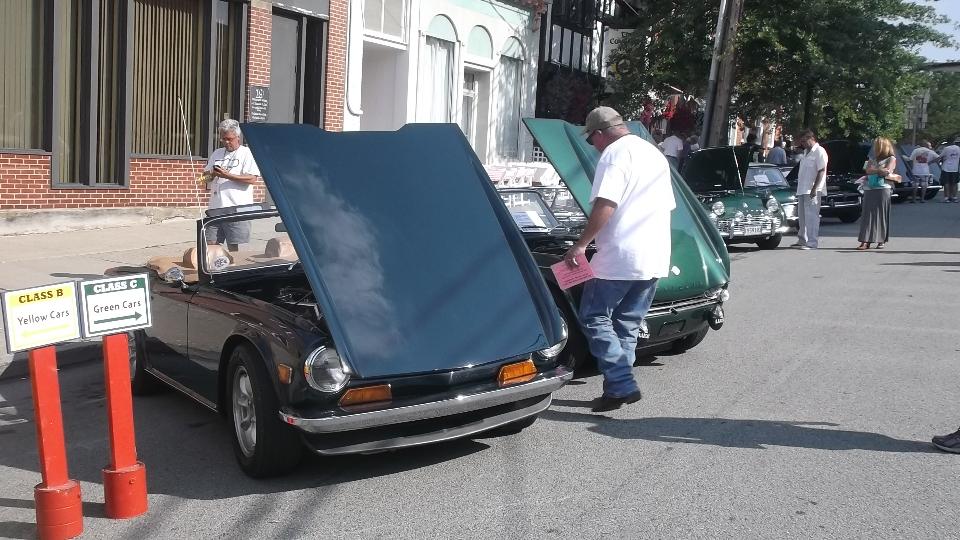 Slept in, missed the morning tech session on the TR race car in the show room. Spent time posting pictures to web page (to be uploaded later). Enjoyed great ice cream from the mobile truck on a hot day, along with some entertaining yard games. Went a bit early to Indiana, PA, so we could hit McD's for WiFi to upoad photos. Then off to the car show on 6th street, right in front of The Coventry Inn restaurant. For this round the British cars were grouped by colors for the "concours de elegance" exhibitor choice voting.
