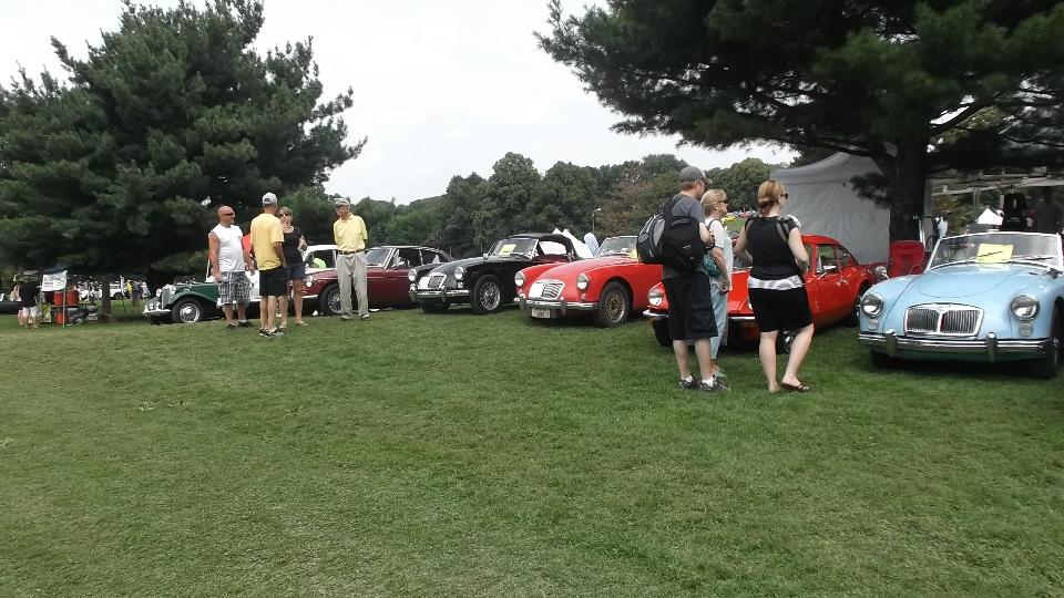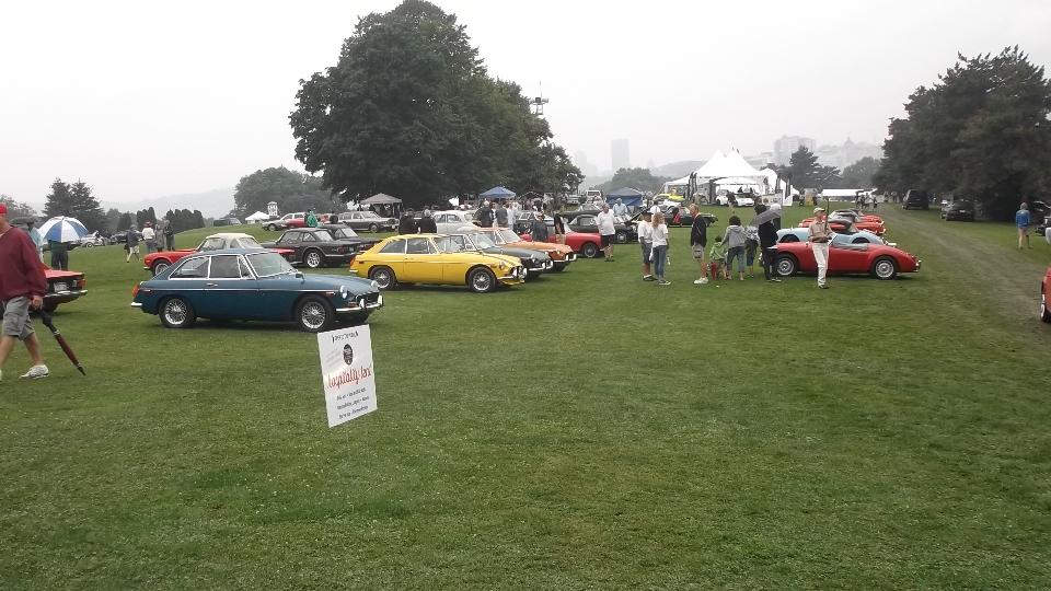 Lots of TR's (since the TR club was a prime instigator of the Brit Car Show), and a good assortment of MG's (in spite of the rain). There were a lot more cars than appear in this one picture.