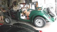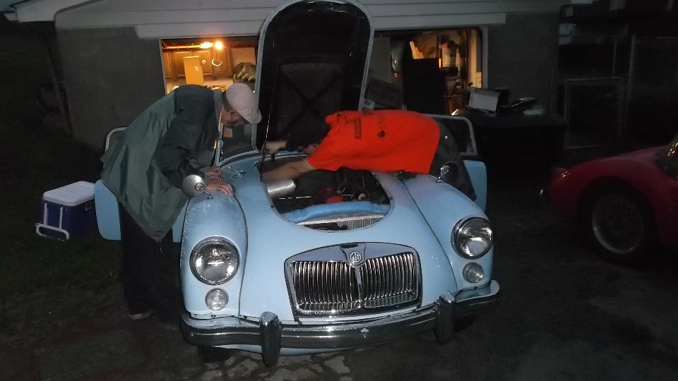 While returning to Brian's place I notice his MGA seems to be running very rich with lumpy idle. A quick inspection reveals a sticking choke (main jet) on the rear carburetor. One poke and it pops back up, and the engine resumes nice smooth idle. Diagnostics done, curing the sticky jet can wait for another day.