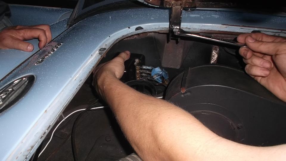 This MGA 1600-MK-II belongs to Joe McCurdy in Charlerol, far south PA on the Monongahela River. We followed it home, and good that we did. It died once with dead battery and needed a push start to get home. Diagnostic work revealed a duff control box. A spare unit was in hand, but had screw terminals rather than Lucar push-on's. We used male Lucar wire ends to fashion push-on adapters for the terminal posts to avoid modifying the wiring harness. Finished the job just at dusk, good to go back to Pittsburgh again tomorrow.