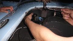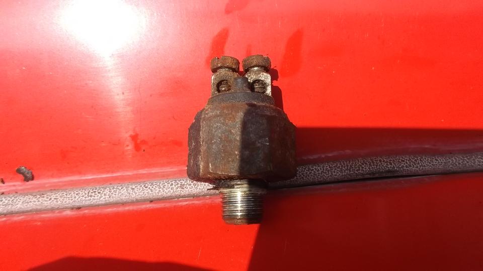 Final testing of turn signals and 4-way flashers (my contrivance) reveals a faulty flasher unit, which again seemed to be working okay the day before. Sheesh. This one was a cheap Heavy Duty flasher unit from K-Mart, two of which have failed in the past year. Brian quickly finds a suitable replacement Heavy Duty flasher unit (another gift from Brian). To use the original screw on forked wire terminals we drill and tap the Lucar type spade terminals on the flasher unit for the #6-32 screws, and it is soon installed and working.