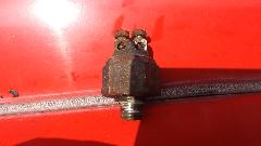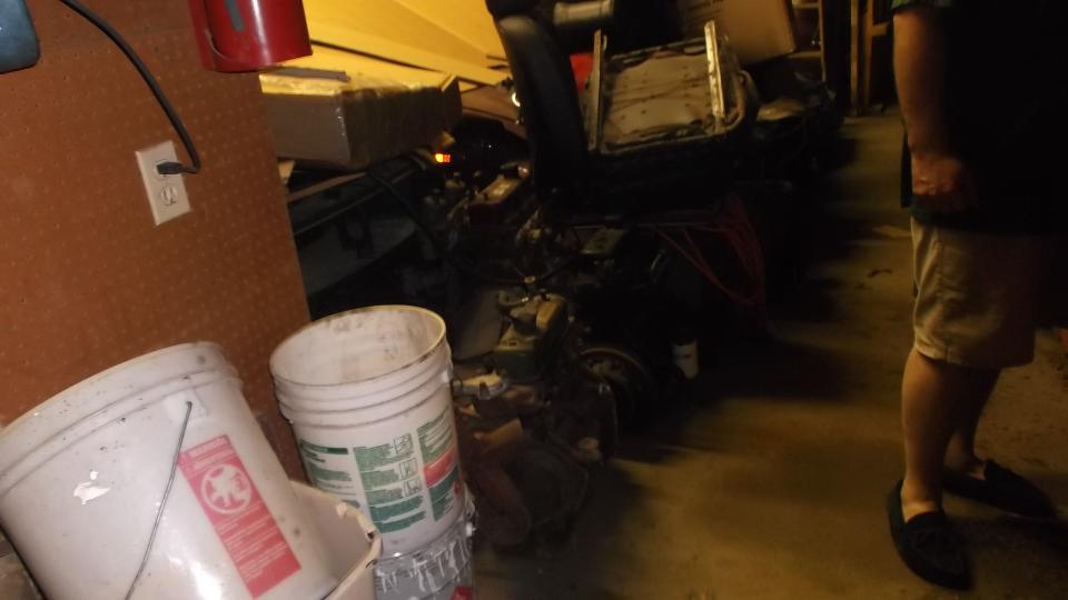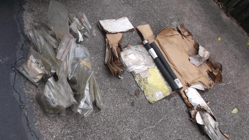 and not working at all the next day, not with any amount of pedal pressure. Not the normal failure mode of gradually increasing pedal pressure requirement. Okay, get to the important stuff first. I drug my spare parts box out of the trailer to deal with a wet and decomposing box. (Going to have some work soon to waterproof the trailer). Not much left of the box, but most of the contents have survived okay. Brian found a new box about the same size as I was setting the contents out to dry.