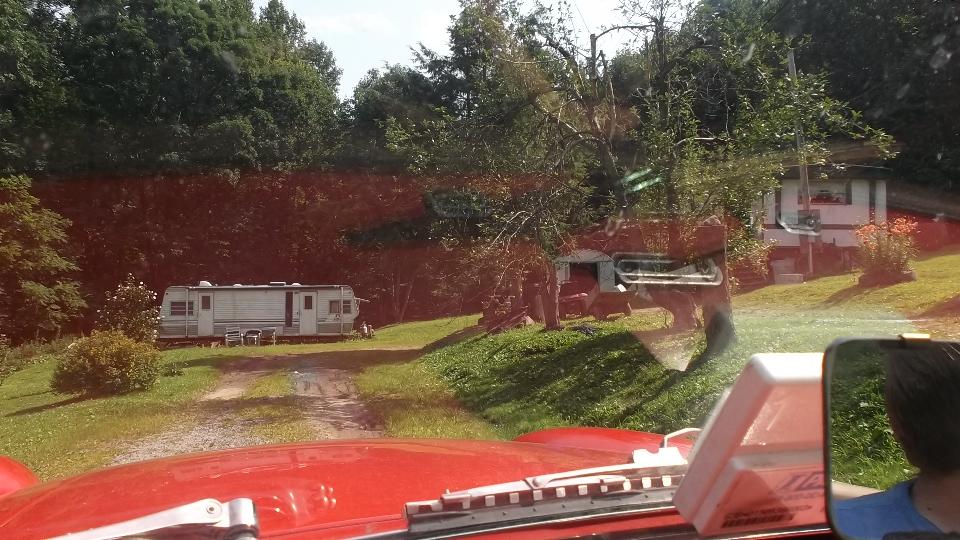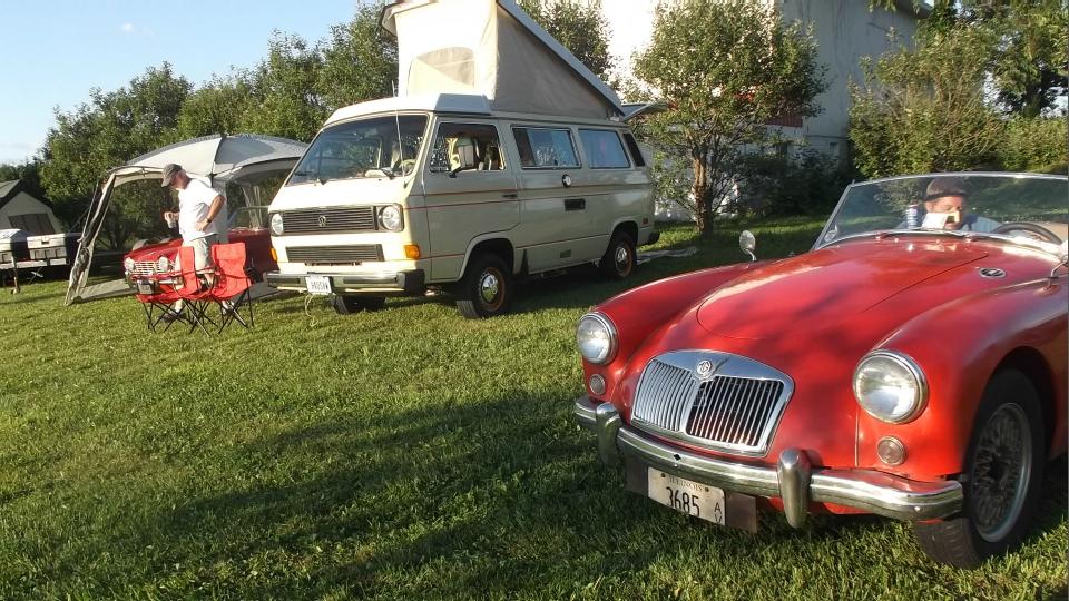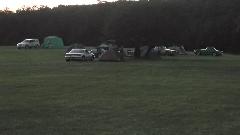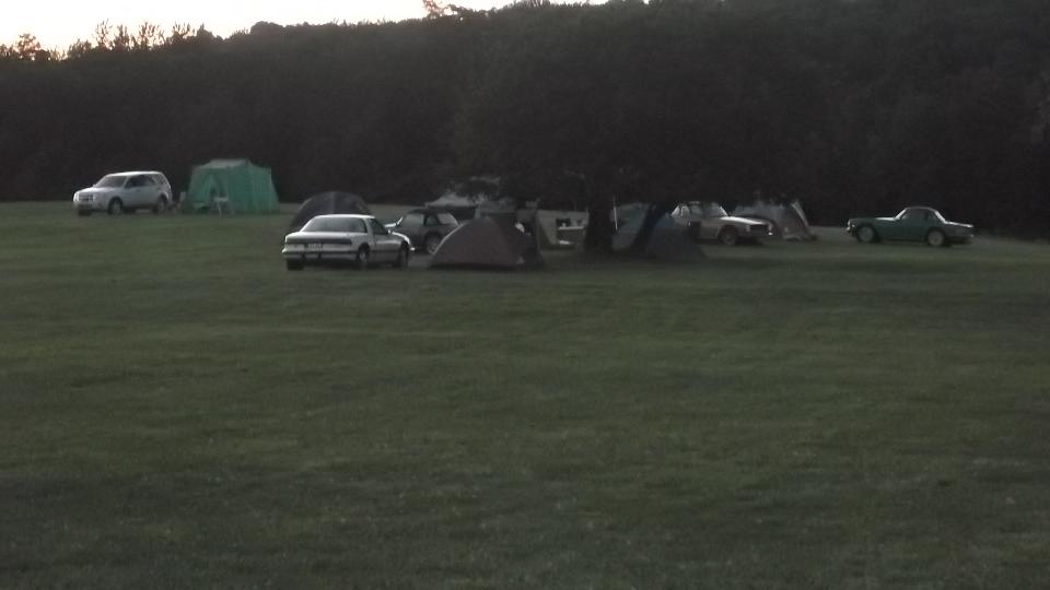 About 50 miles shy of destination, a mountain road designated by Mapquest as Crum Road does not exist. Several miles into the mountain we spent at least an hour trying every loop road in the hills, and still no joy, no Crum Road. Dodging many deer along the way, we kept returning to the same fork in the road. At dusk we finally gave up and head back to the main highway. Long story short, we ultimately arrive at The Roadster Factory at 11-PM, find a place in the grass, and pitch the tent in the dark.