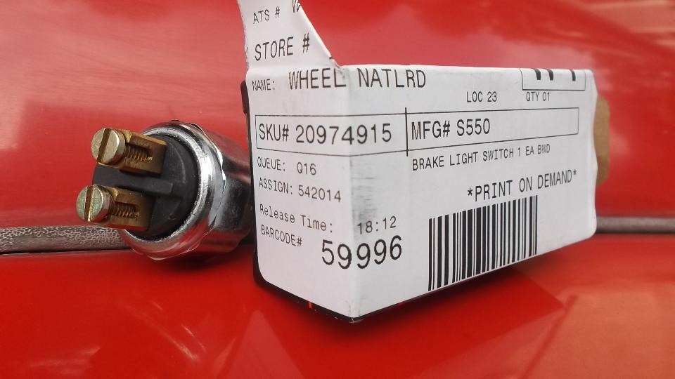Back to Advance Auto Parts to pick up the new brake light switch. Borg Warner number S550. Same part number for Advance Auto Parts.
