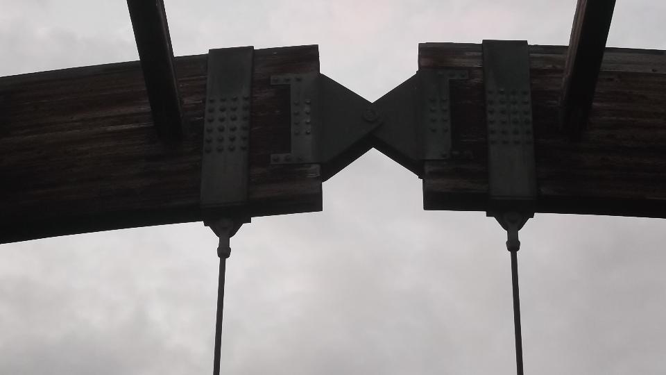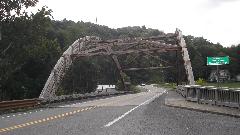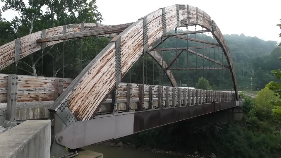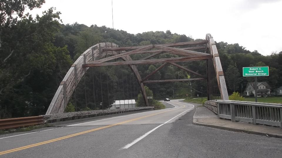 This bridge caught my curiosity, the Robert C. "Bob" Beach Memorial Bridge, crossing Dunkard Creek on Route 39 in the western end of Monongalia County. It is a suspension bridge with the main structural arches in wood, and the under pinnings in iron (or steel rolled and welded). Not as old as it looks, built in 2001.
