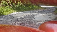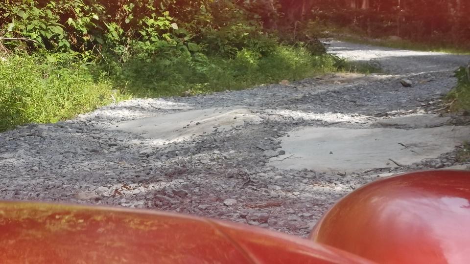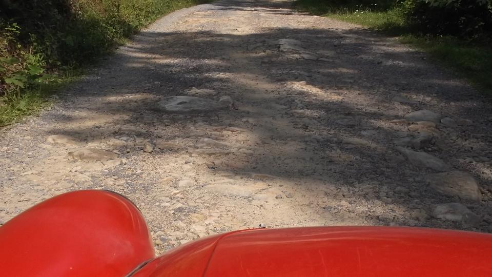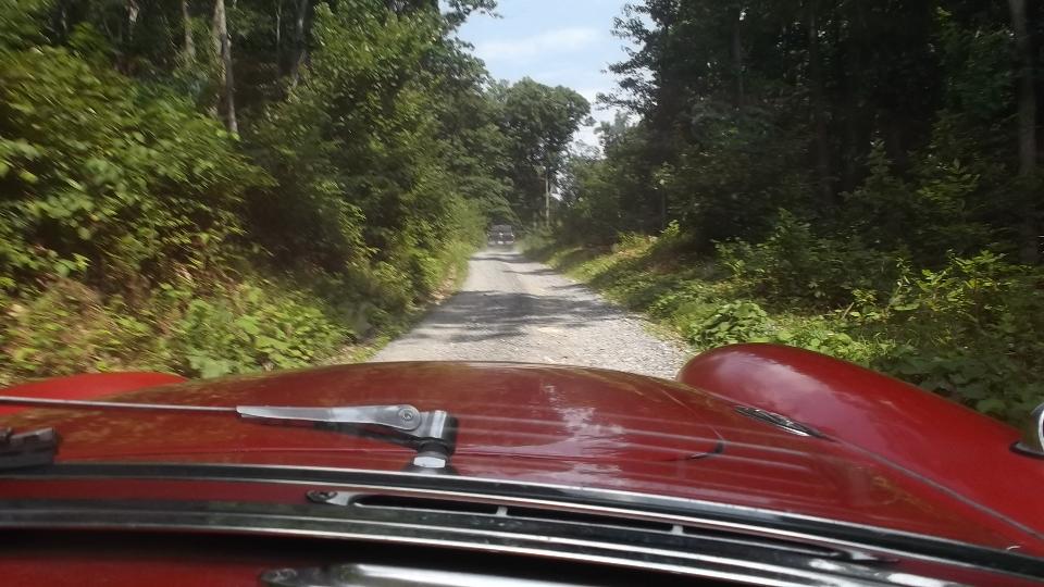 First fork to the right was a 10-mph road (mostly) that ran about a mile to terminate in a "cul-de-sac" among several small cabins in the woods, where we had to turn back. Taking the left fork led to a 2-5 mph road (if you could call it a road) twisting and climbing sharpy through rocks and potholes. We found a small spot to pull over momentarily to allow a 4WD P/U truck to pass. That was hardly necessary, as he wasn't going any faster than us, and we were keeping up with him for the next 20 minutes, at a snail's pace (thank goodness for 6-inches ground clearance under the MGA). We eventually arrived at a "4-way intersection" (sort of) where the road to right looked a little less foreboding than the others. The truck went right, while we appraised the road as getting worse as it went. Not that we couldn't continue, but not knowing how much farther this would go on (or possibly dead end), we decided to go back. Caulk up another 30 minutes getting back to Cheat Road.