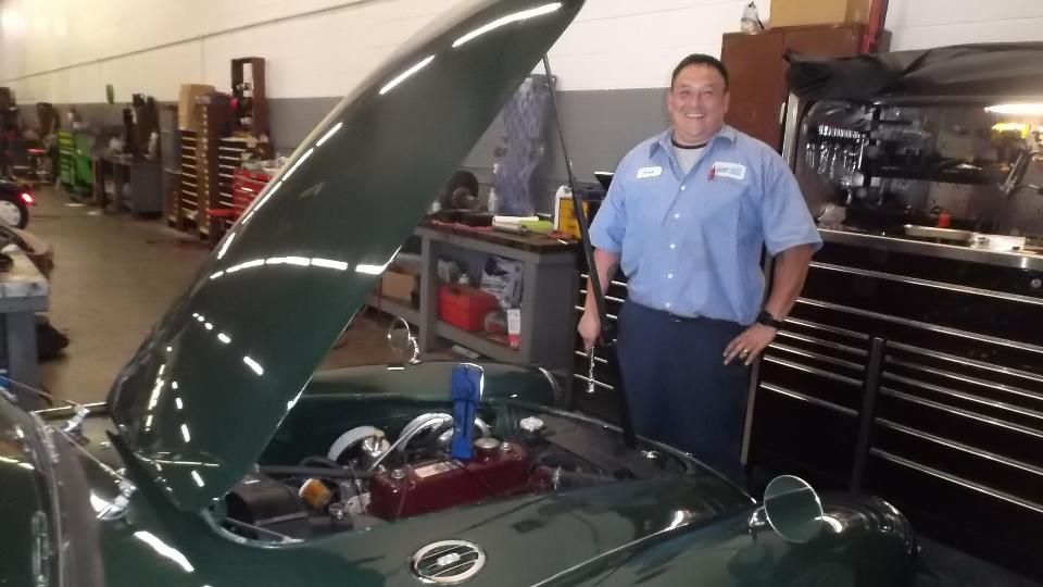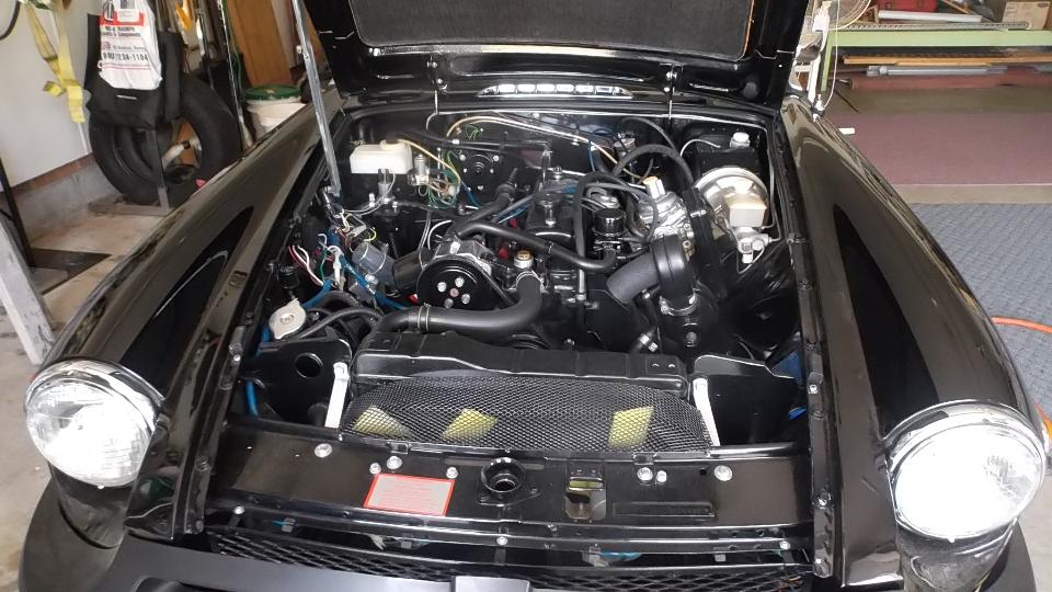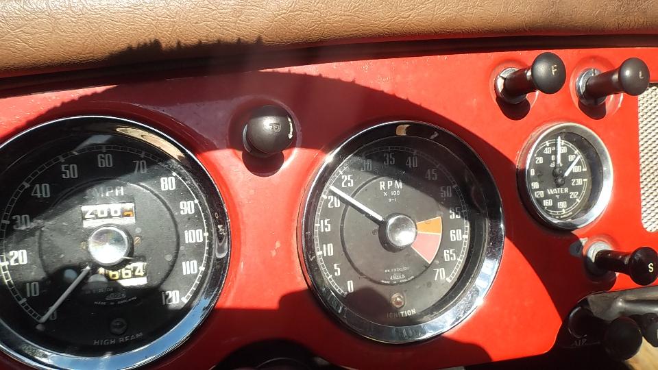 The MGB GT is a fresh restoration, still sporting a couple of zeros on the leading end of the odometer. Sluggish at low speed? Tech time. There was a quick switch to move the distributor vacuum connection from intake manifold to carburetor port, after which we expect it to run better.