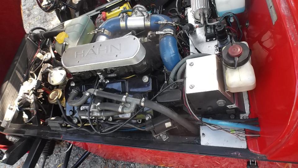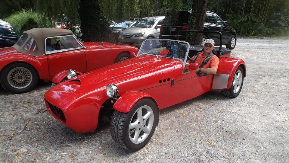 Today we had a mid day meeting with John Sensor from Hendersonville, NC. He "used to have" an MGB which he bought new and drove until it dissolved in the Chicago area winter salt. These days he drives a Lotus 7 clone with a Honda motorcycle 1100-cc engine, turbo-charged with water injection intake cooler, red line at 11,000-rpm, about 240-hp (in case you can hang on to it long enough to try it out). Yes, you do need the shoulder harness. I declined the test drive this time.