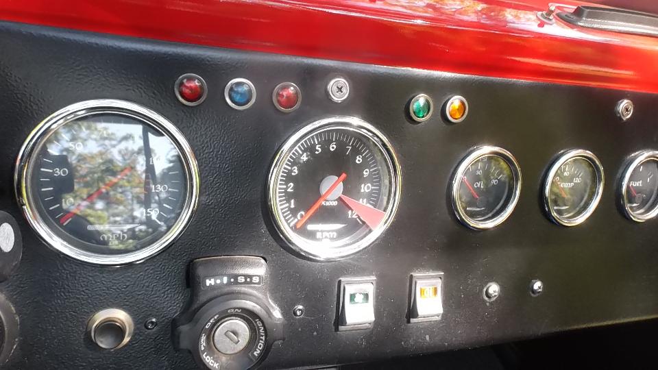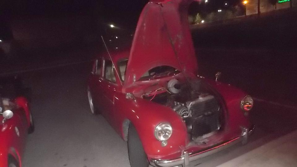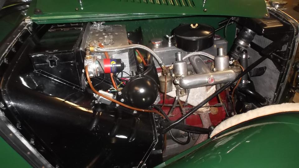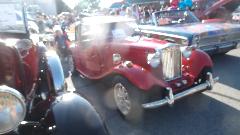 In between tech sessions, an MG TD in distress. Dead battery before arrival, jumper start to get it into the car park, battery charger for partial charge to get it going again. Problem here was a control box that had drifted out of adjustment leading to low voltage which would not keep up with power demand when running. Handy volt meter and a small adjustment for the regulator relay, and it's all smiles.