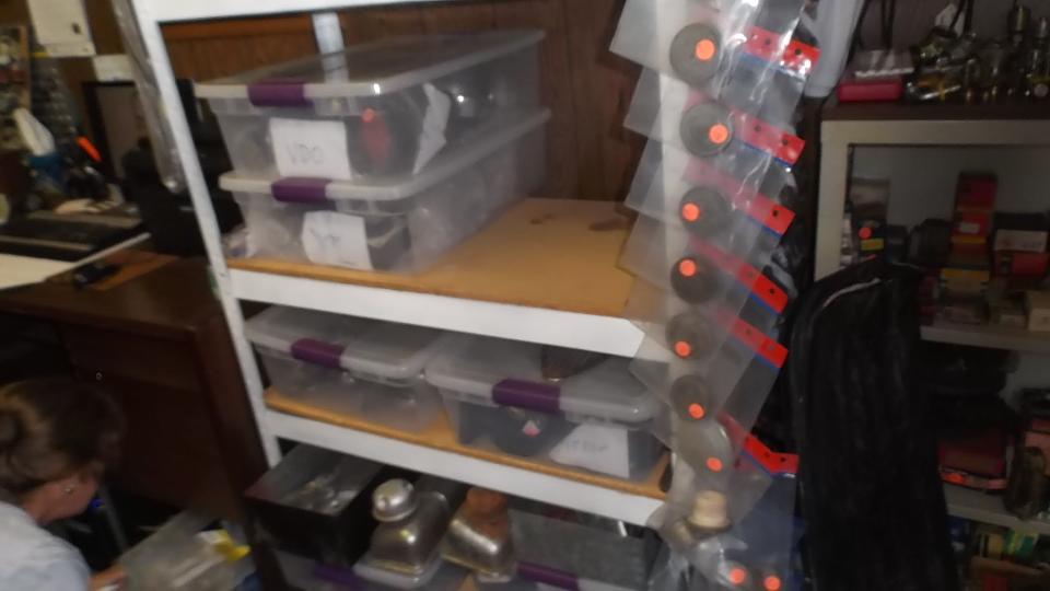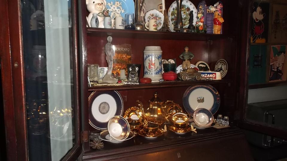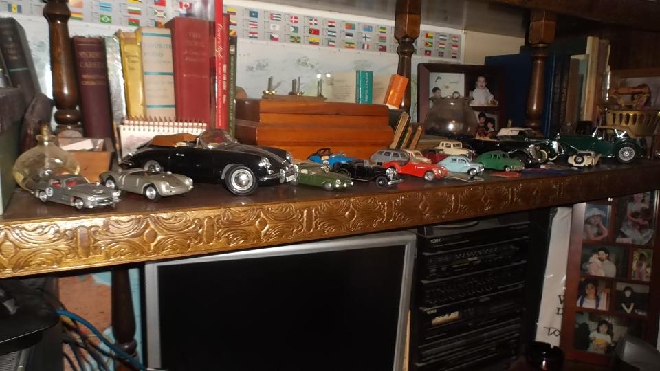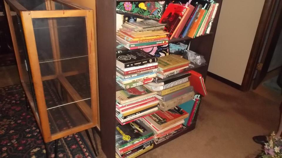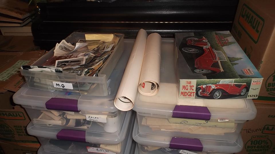Today we dropped in to visit Marian Inman in Hope Mills, NC (Fayetteville area). She recently inherited an MGA, along with a huge load of parts for lots of different classic cars, and about 40 years worth of memorabilia and collectibles (including a large technical library and thousands of magazines). The car has since been sold, but we were here to check out the other goodies to identify stuff and help decide what to do with it. Start with some pics of the collectible stuff.