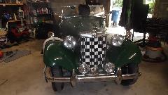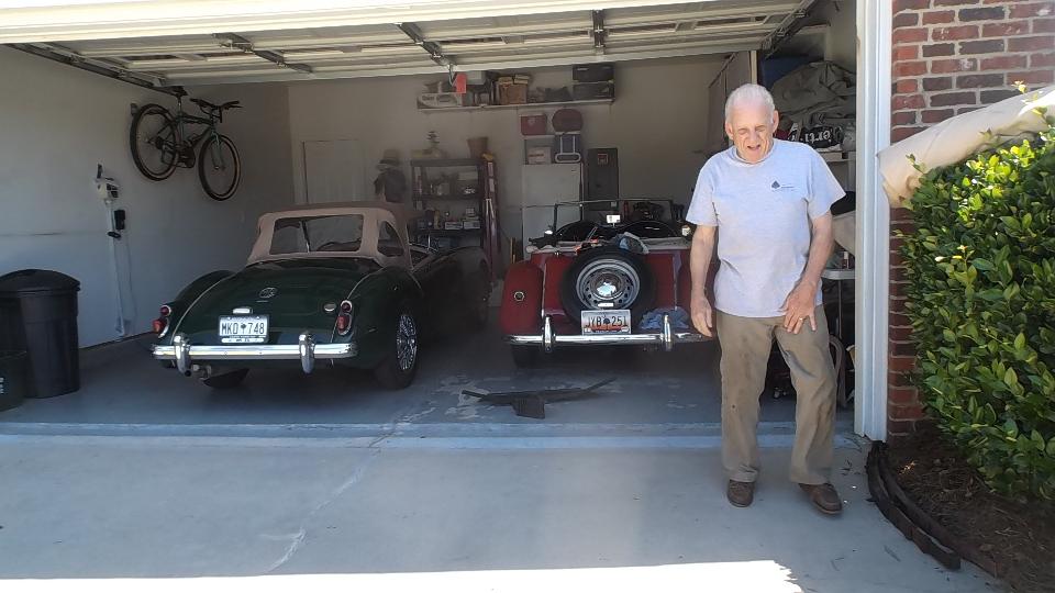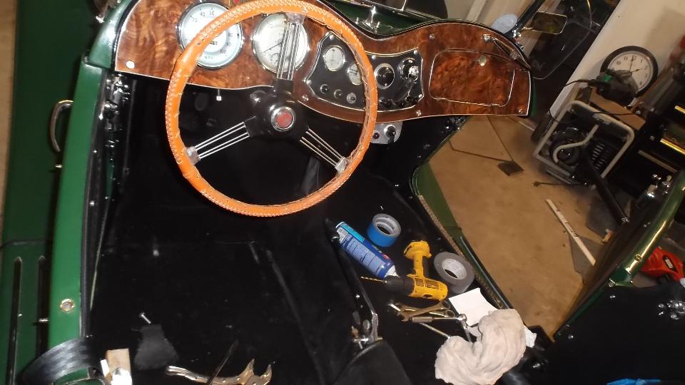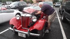 Mid morning appointment today with John Merhar in Hickory, NC. Once we got past the Porsche Boxter S in the driveway, we found John working on his MG TD, installing new carpet and reinstalling seat belts. It is a clean machine, needing not much except to reinstall the seats. There were a few interesting spare parts, like a very vintage Mallory dual points distributor (with two piece HT cap), a generator with the rear tach drive, a new modern distributor, and an alternator considering a new home.