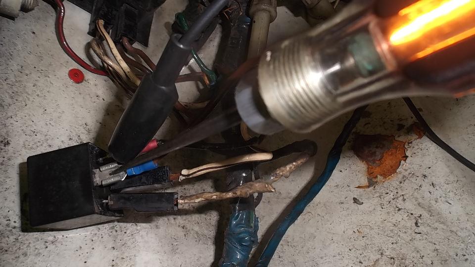 A bit of diagnostic with a test light revealed a variety of problems around the ignition relay. Most of the terminals were badly corroded, had been overheated, and/or were wiggle loose with bad connections. I hate Lucar connectors, often more problems than bullet snap connectors. Poked with a test light, the (hot) brown wire fell out of the Lucar terminal. Cut and strip the wire and install a new female spade connector, scrape and clean the male terminals, bend tabs a bit to tighten the female connectors, and eventually we had the wires making good contact. Then the relay had an intermittent internal connection. Luckily there was a new relay handy, installed in short order, and then we had spark.