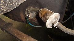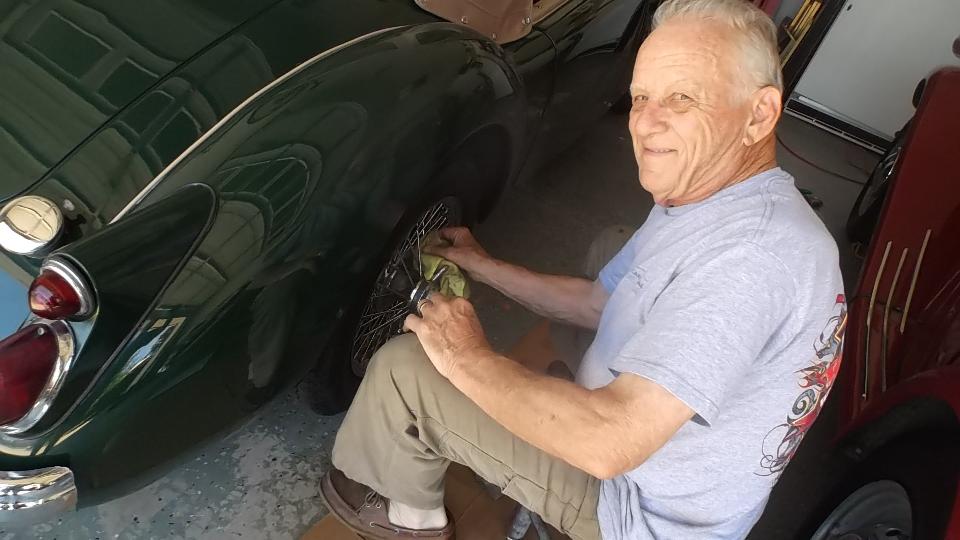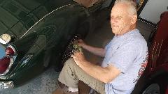 Oil pressure gauge now working, it was time to fix the coolant temperature gauge. This turned out to be another corroded wire terminal on the temperature transducer (below the thermostat in the cylinder head). Then the fuel gauge was not working, leading to back it out of the car port and remove a rear wheel to test the fuel sender unit resistance and grounding the signal wire, but still no go. Final fix was to reconnect a power wire between the voltage stabilizer and the fuel gauge. Then the fuel gauge would move from nothing (against the "E" peg) to the middle of the "E", which is likely correct for having half a gallon of fuel in the tank. Grounding the signal terminal would drive the gauge to the "F" peg, so the gauge works. Finally drove it back into the car port and got the victory picture (big grin). Note to owner, put brake fluid in the master cylinder.