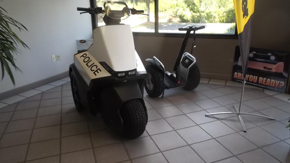 While here, we got a little tour of the place and some of the vehicles they sell and service. First up were the Segway "scooters". These things have evolved from big (adult size) to small (teen size) to tiny (little kid size), and also into super size. The three-wheel police version can cruise up to 25-mph, which is pretty brisk when you are standing up straight. On the larger end of the scale they have street sweepers and snow plows. In the middle they have a large variety of floor scrubbers and other factory service vehicles. Photo below right is a Vantage truck. In other countries it is a road going vehicle. In the USA is is not street legal so it is governor limited to 25-mph but carries a substantial load for commercial off-road use.