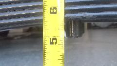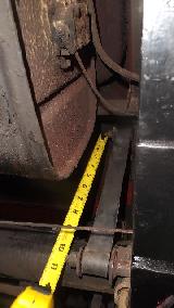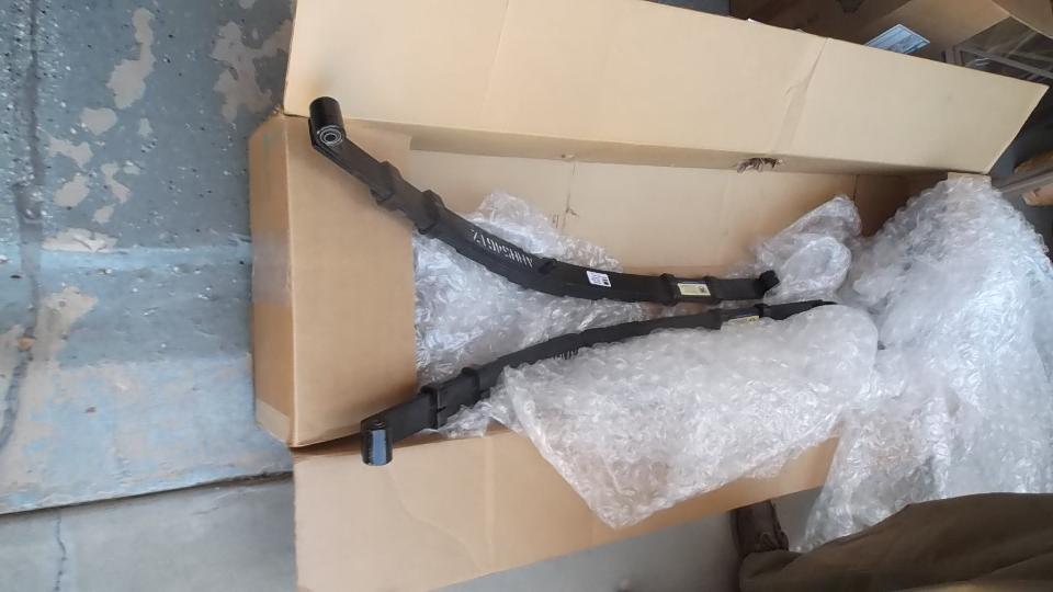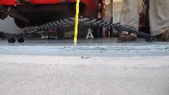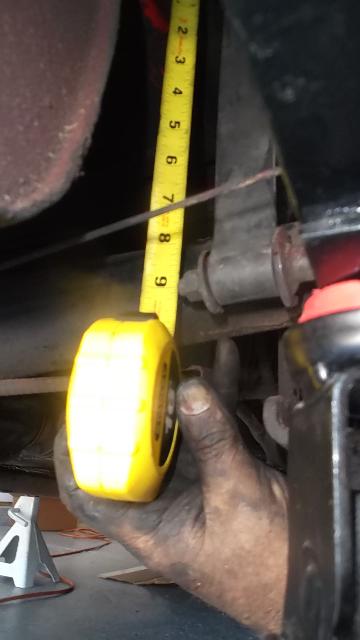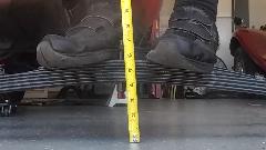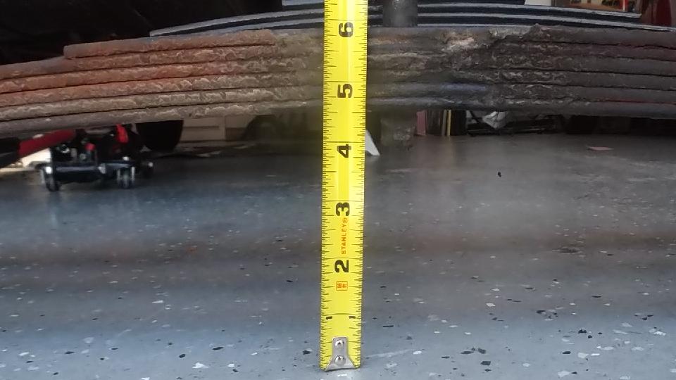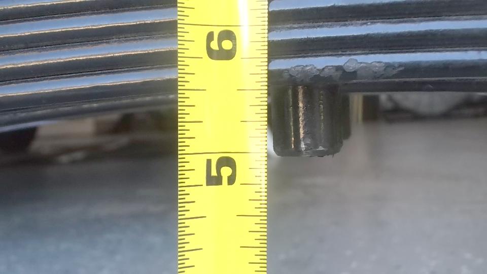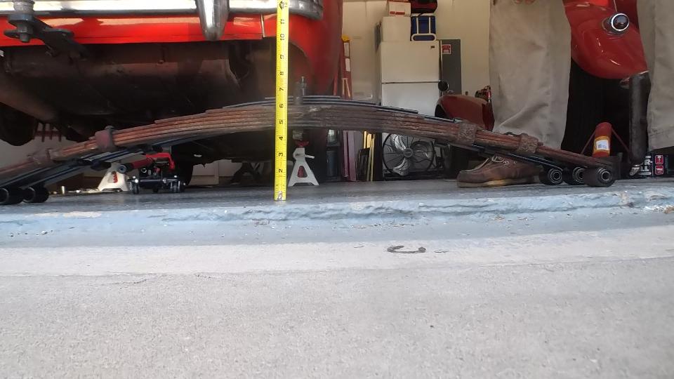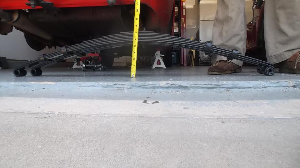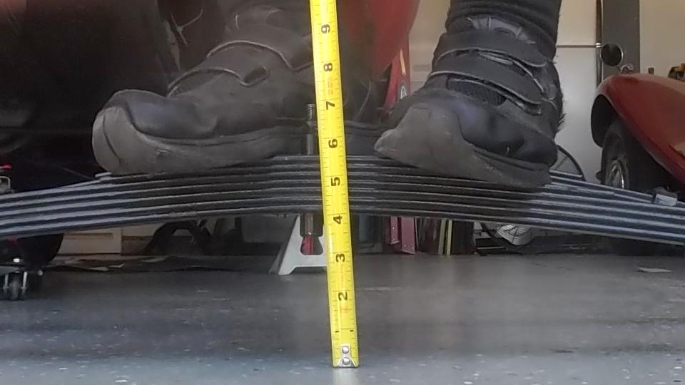 Upon removing one of the original springs we gave it the same test for free height and deflection. Free height measured 4-9/16 (1/2-inch lower than spec). Partially compressed with 220-lb load brought it down to 2-3/8-in for 2-3/16 deflection or 100-lb/in spring rate. That was a surprise. No wonder the springs were sagging so badly. I suppose the reduced spring rate was due to wear making the leafs thinner. So 450-lb load would give deflection of 4.5-inches, or 0.9" excess defection, in addition to being 1/2-inch too low at free height. When upside down that would push the spring completely to the floor, or 1.4-inches too low ride height fully laden. So if the old springs rode 1.4" too low, and the new springs are expected to ride 1" too high, this may raise the rear end of the car 2.4-inches (or maybe 2.5" at the hitch ball).