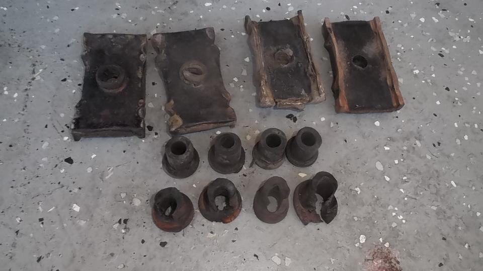 Jack under the axle to raise it until the frame lifts off the jack stands (loaded condition), then tighten bolts on the Silentblok bushings in forward spring eyes and the shackles at the rear spring eyes. The rubber parts that came out and were replaced didn't look too bad for being 18 years old with 200,000 miles. The better looking grommets were in the frame holes at top of the shackles, while the worse looking grommets were in the rear spring eyes. I would recommend poly bushings here.