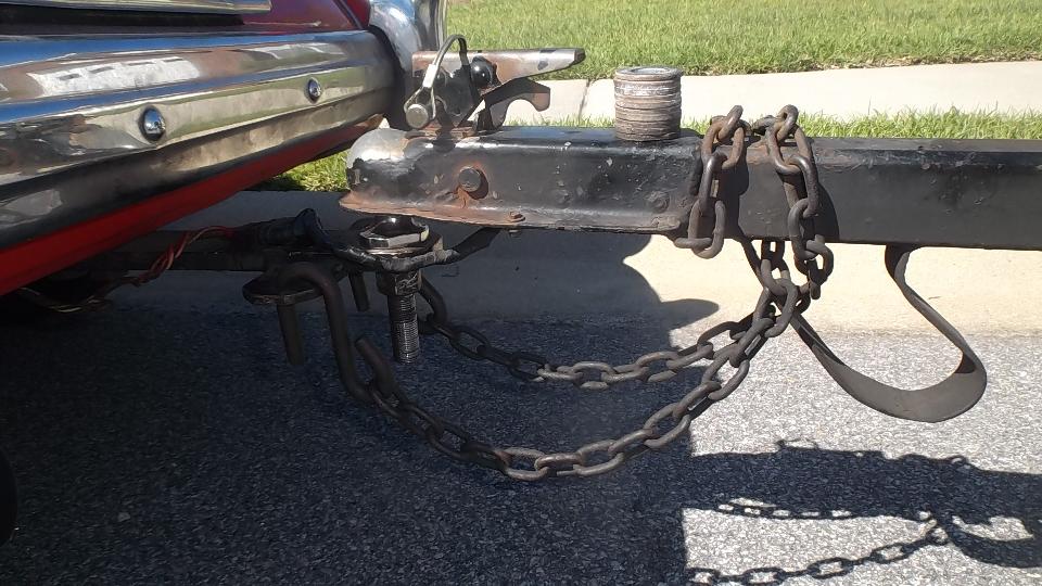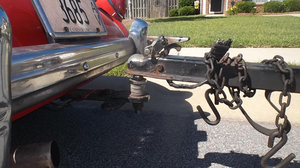 Now that we had the rear of the car raised to about an inch higher than original stance, there was a small problem with height of the trailer hitch. It was time to remove the 1-3/8-inch stack of flat washers I had so diligently installed in October 2014. Below are before and after photos for the hitch height change, making the trailer sit level again.