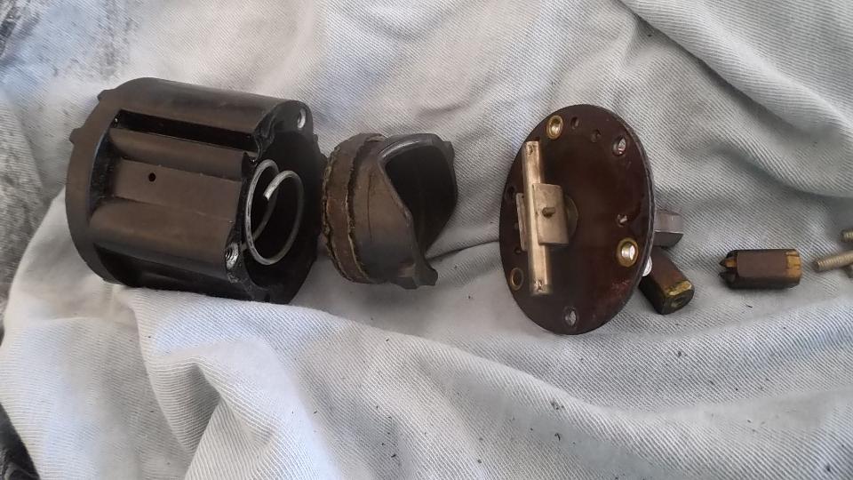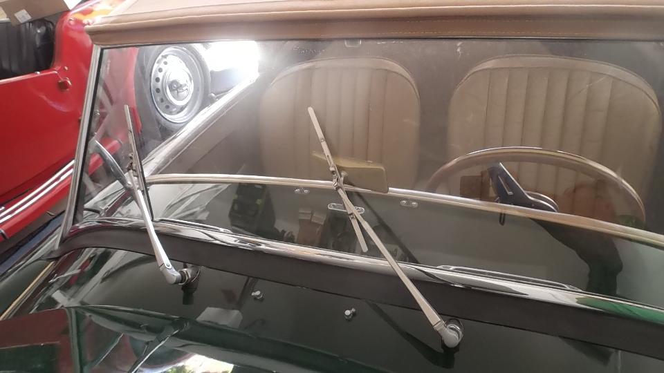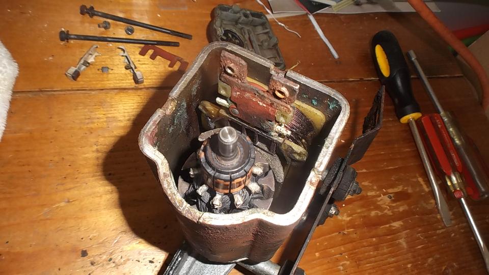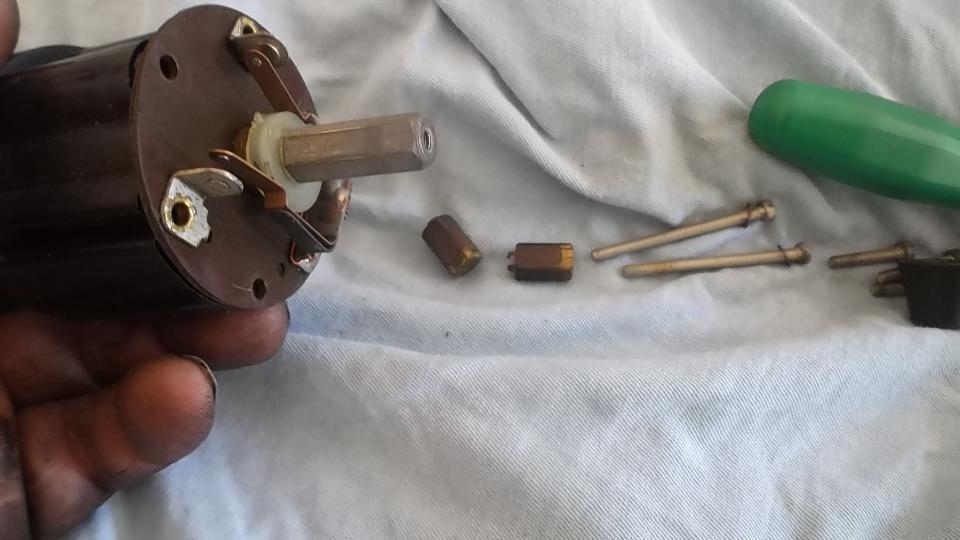 at least half an hour, as you have to remove master cylinder pushrods, pedal excluder boot, cross bolt, and drop the pedals on the floor before the wiper motor can be disconnected from the drive pipe and pulled free. Inside I found the brushes to be in serviceable condition, but the commutator segments were a bit burned and in need of cleaning. The parking commutator also had intermittent contact,which was helped by bending the contact arm slightly upward, and cleaning the contacts. With the motor running and all back together, wipers work and park in the correct position.