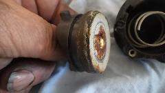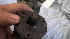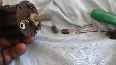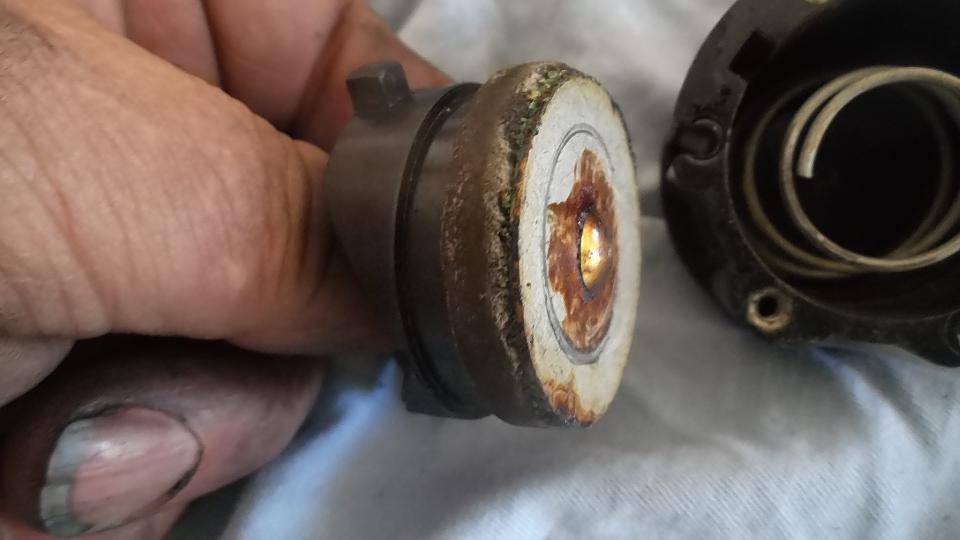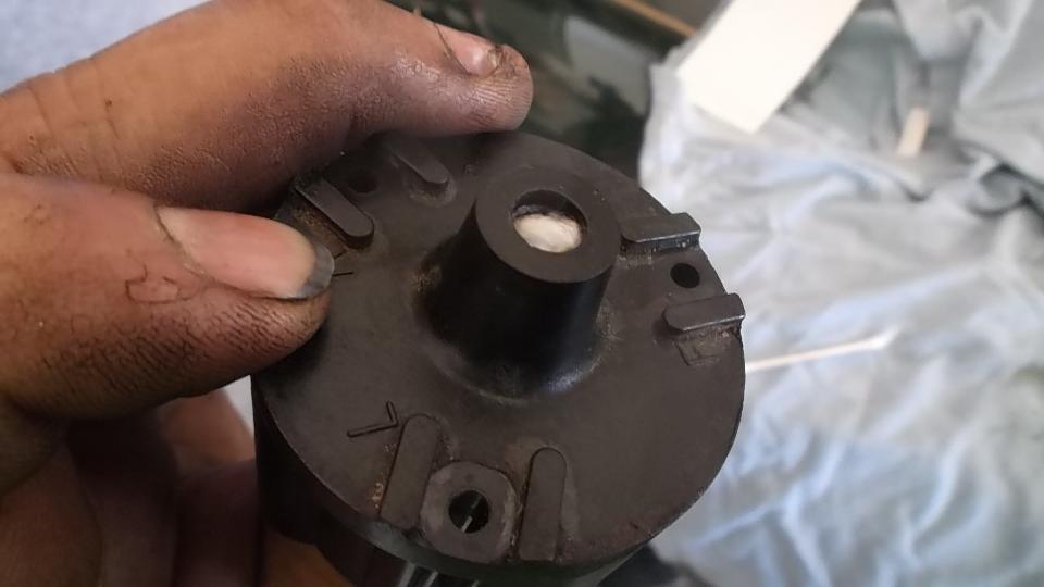 Then we went after (attempted) repair of the pneumatic time delay trafficator switch which was shutting off immediately with no time delay. Out of the dash and disassembled reveals the issue as a leaky sucker washer, the leather lip piece not keeping a vacuum tight seal with the housing. Clean this up with a bit of mineral spirits, and apply a dab of silicone grease (or red brake grease). If the leather cup is still not making a seal, then cut a strip of thin card stock to insert behind the leather lip to make it bit thicker.