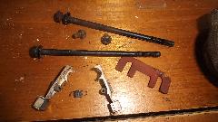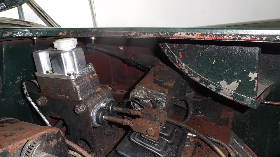 Then to replace the worn pushrod and clevis pin for the clutch slave cylinder. The DPO had welded an extension onto the pushrod, but the new one is correct length and works well. Give Dave a few minutes break and he will be cleaning the wire wheel spokes, a never ending chore.