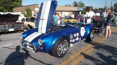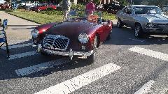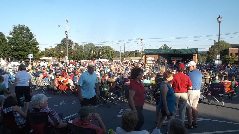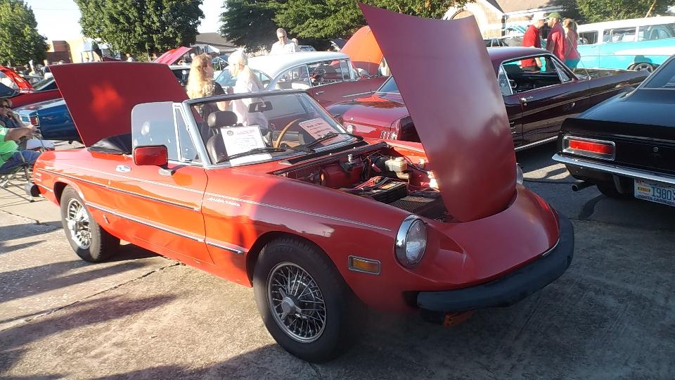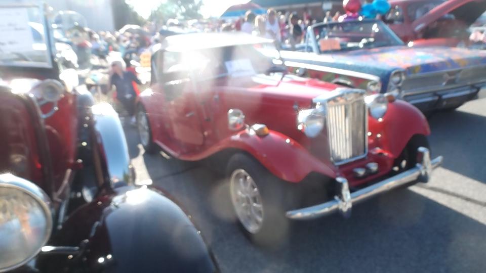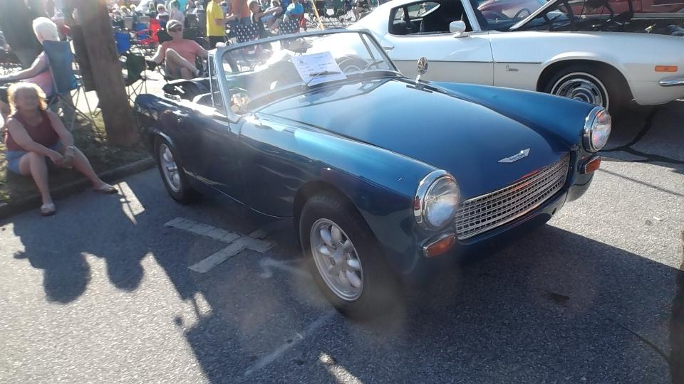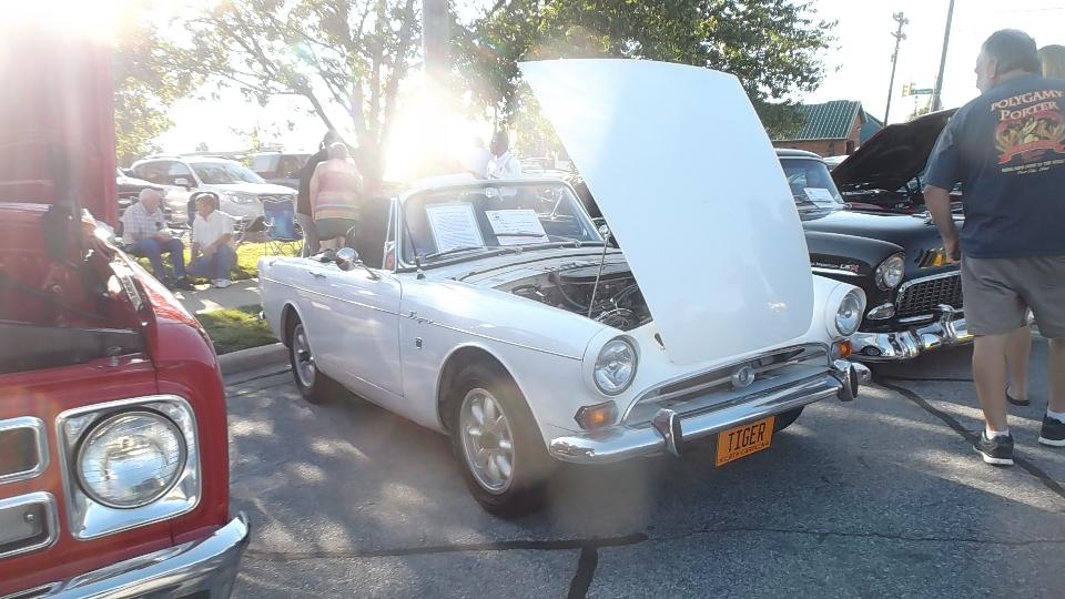 Next morning found us back on WiFi in Spartanburg, still in South Carolina. Trying to arrange purchase of a pair of trailer tires for delivery in Louisville, KY, we stumbled on a dealer in Spartanburg just two miles away who had them in stock for very reasonable price. So off to the tire shop briefly, then a trip to Walmart for oil and antifreeze and a new steering wheel cover, then back to WiFi. While checking bulletin boards we found an evening classic car show in the streets of Hendersonville, NC, so we were off again in a flash. An hour later we were nursing the rig into a remaining tight spot on Main Street to spend a few hours among a couple hundred classic cars and what may have been more than 1000 people assembled for live music. Let's see about the British cars first. Sunbeam Tiger and the other MGA,