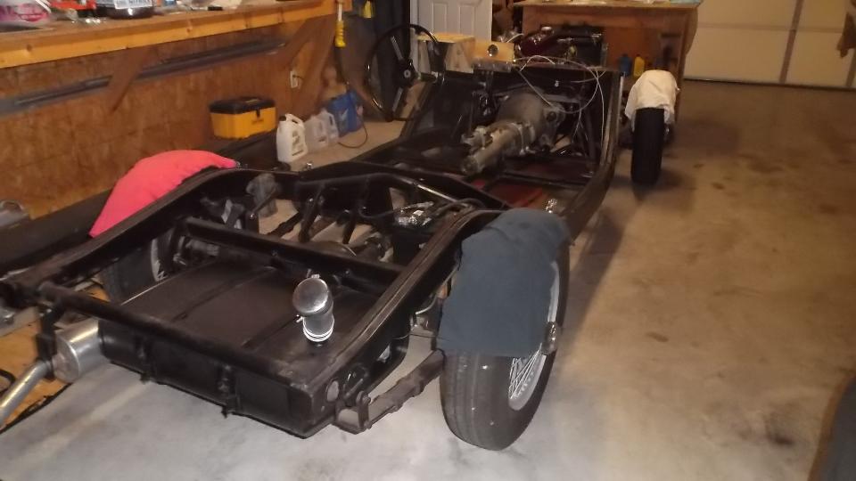 A couple hours later it was all back together. Then some bad news. The new rebound straps I installed a few weeks earlier are garbage, worse than useless. Free length measures 9-inches center to center on the bolts. When the rear axle is allowed to drop the rebound straps stretch without limit. Stretched length measures 10-1/2-inches, and the only thing that stopped it there was end of travel in the shock absorbers, which is what the rebound straps are intended to prevent. Rebound straps are not supposed to stretch at all, or certainly not more than 1/4 inch under load of the axle weight and leaf spring preload. These straps when installed give the impression that they should get the job done, leaving the car owner with some confidence that all is well, when in fact damage to the rear shock absorbers is imminent. Another note to Moss Motors is due soon.