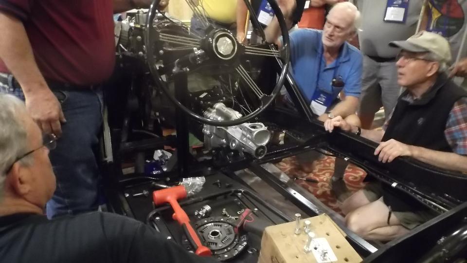 Always some minor maintenance going on, and some interesting cars on hand. Time for the morning tech session on 5-Speed Gearbox for Post War MGs. Out with the old and in with the new, right before your eyes.