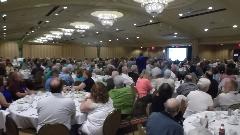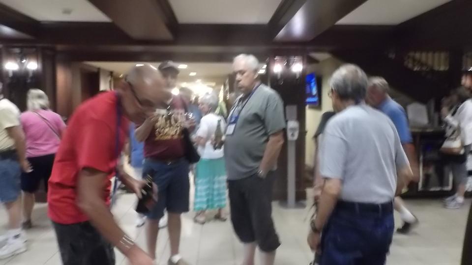 In the early evening there was a First Timers Reception (1 hour) which I was requested to attend (perhaps technical reference for the new folks). This was followed by four consecutive Register Night banquets in adjacent rooms (2 hours). Sorry if you belong to more than one of the national MG registers, can't be in two places at once. Then the partitions between banquet rooms were opened to combine all into a single gigantic room looking like an airplane hanger. For the next two hours we had live entertainment by Captain Rat and the Blind Rivets Band. Wow! Five hours in the banquet rooms without stepping out. And after 10-pm lots of folks headed for the Lounge to chat. That bunch in the photo below center is myself with some of the Australian world travelers.