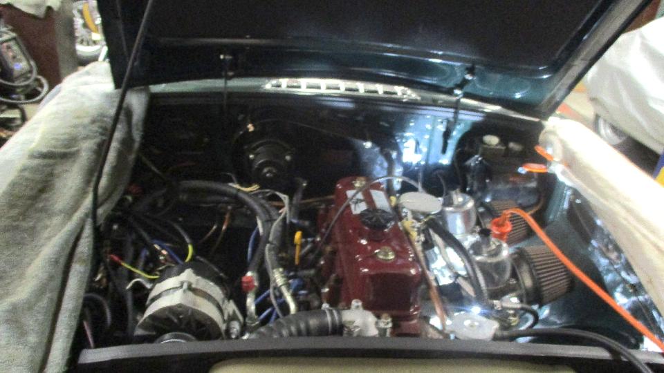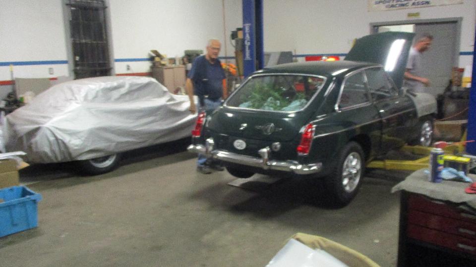 The club meeting didn't run too late, so we made a call and then drove about 20 miles south to Danville, VA to visit Jim's shop, Southside British Cars. An interesting place with a variety of nice British cars outside and inside. And there was the Green GT they had dubbed "The MGB From Hell". Story was, they had seen this car a few years earlier when it had 40 psi oil pressure under all conditions. Now it had come to their shop for service showing 20 PSI oil pressure under all conditions.