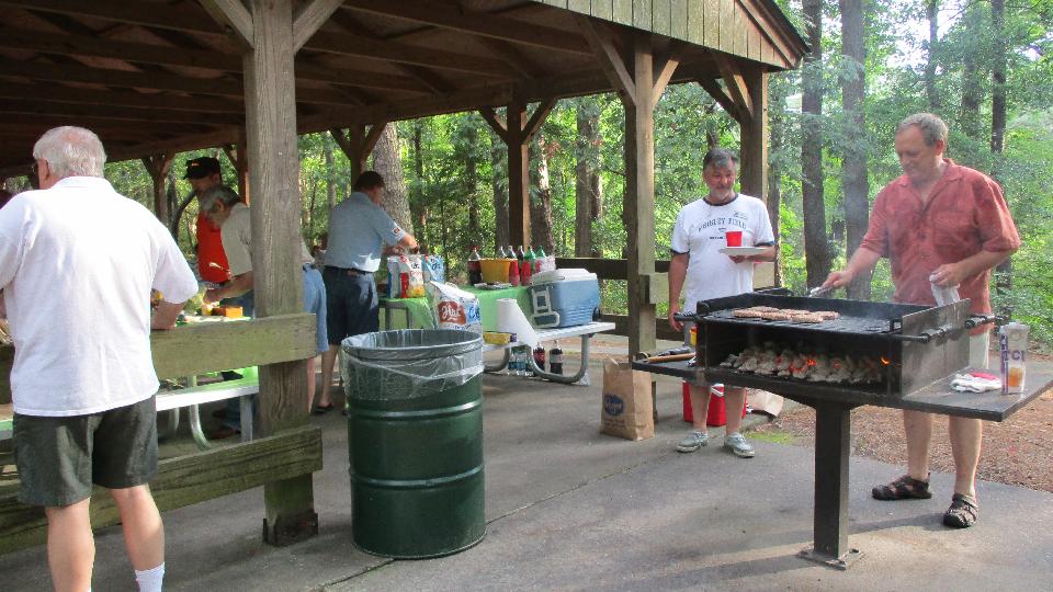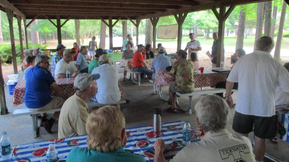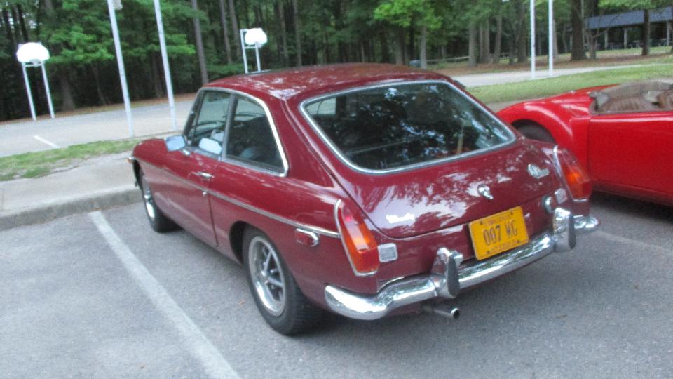 in Virginia Beach, VA. They do this picnic in the park thing occasionally, weather permitting. This time we drove briefly through a rain storm to get there. Weather was dry during the meeting but the storms seem to have scared off some of the club members and a lot of the MGs. There were about 25 people to go with half a dozen MGs, including three BGT's in the car park. Nice BBQ, drinks and deserts, and a good business meeting as well.