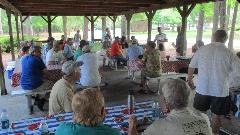 Got busy chatting and missed the people pictures, but did make a bunch of new friends. After the party we hit the expressway heading northeast on I-81, and shortly got stuck standing and creeping in hot weather for at least half an hour due to multiple accidents clogging the roadway. Apparently there was a large 5th wheel travel trailer upset and blocking the right shoulder and one traffic lane (no idea how that happened). Then about a quarter mile back there were at least three vehicles in a chain reaction rear ender. And another quarter mile back at least two more vehicles involved in a rear ender. Some people never learn to drive? While sitting and creeping, mostly stationary, a few police cars and a few tow trucks passed by on the shoulder. I recon no one was going anywhere until they moved a few things from the roadway. By the time we got through it looked like they would need a few more flat bed trucks for the wrecked cars, and a cable wrecker or two to upright the travel trailer. So only 80 miles up we called a cooling stop and waited for the sun to subside some. Doing some WiFi work until late, then another 200 miles to land just just short of Gettysburg, PA.