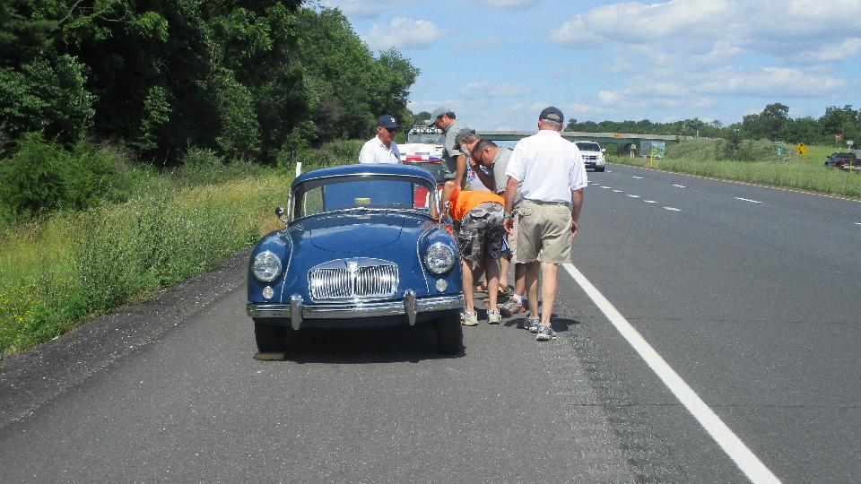 After the street show we were off to Appalachian Brewing Co. for food and spirits with bunch of folks from Clustered Spires British Car Club (but we will get back to them later). A few miles down the road we had a brief stop to offer a hand when the Mineral Blue MGA Coupe suffered a flat tire. Air-in-a-can was not going to help here, as the tire was loose from the rim and the valve stem was torn out of the inner tube.