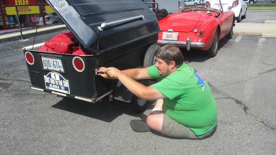 Oh-oh, just caught navigator doing maintenance again. The trailer just hit its 30th anniversary on the road (over 200,000 miles), and wiring for the safety lighting has been "wanting" for some time. It was originally wired up