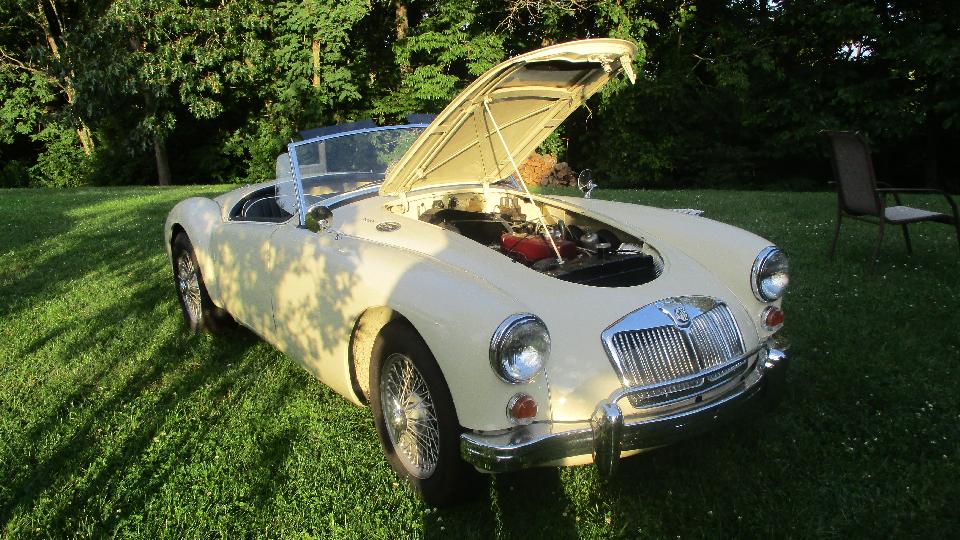 Then we were off for a visit with Bob Stickley in Christiansburg, Virginia. He has a nice MGA 1600 that was hard to start when cold and has a bit of a stutter under load at high speed. Ignition system was in good order. Rear carburetor was running very lean but easily adjusted. With test drive in the hills it seems to run quite well, until running up hill with full throttle around 4500+ rpm it runs out of fuel on one carburetor and goes to running on two cylinders. Rats. Gotta get that fixed fixed sure. Initial check reveals what appears to be adequate fuel flow to the carburetors, but haven't done a dynamic pressure test yet. Also need to check the inlet screens and float valves for clear fuel flow. Something is limiting fuel flow into the float chambers. My gut feeling on this one is low fuel pressure. But that will have to wait for later, as a call has brought a nearby friend to visit for dinner hour, and the rest of the day vanishes in a sea of car chat.