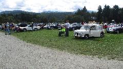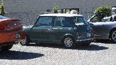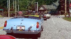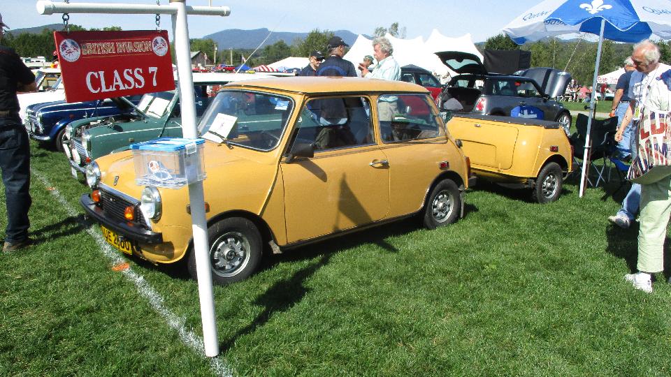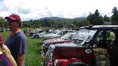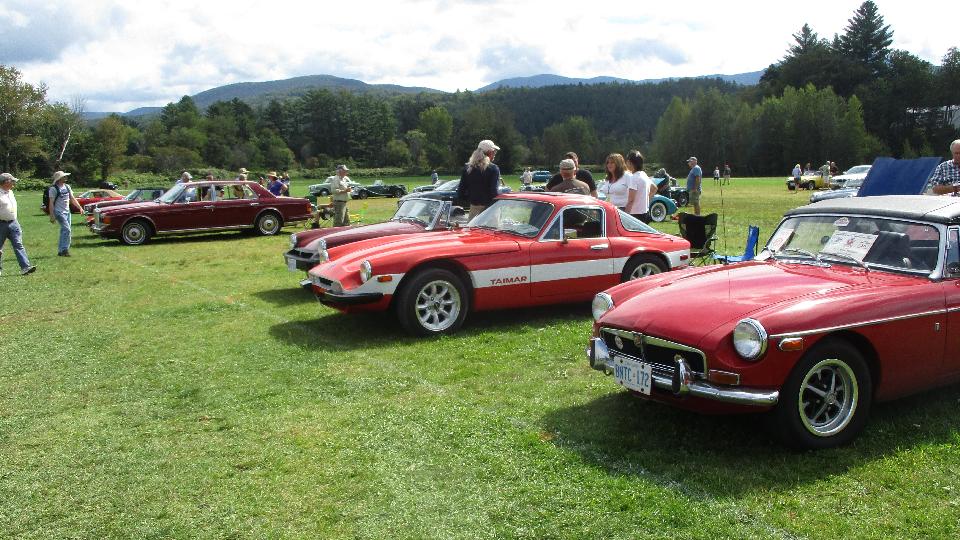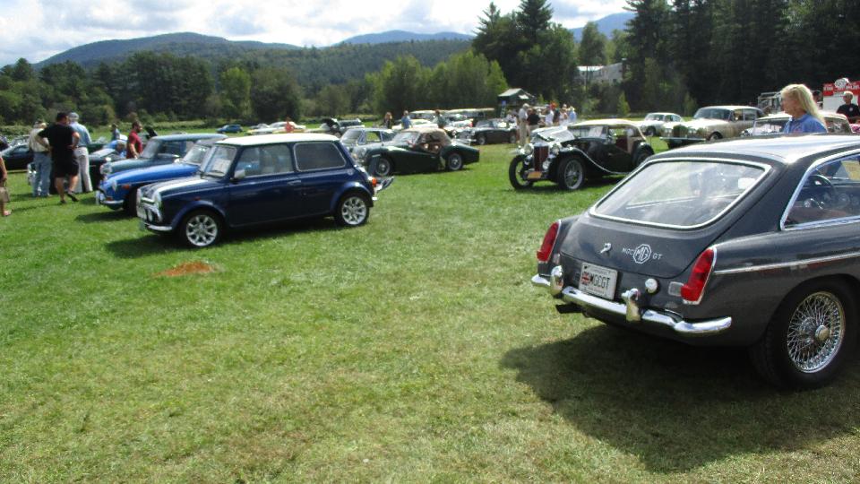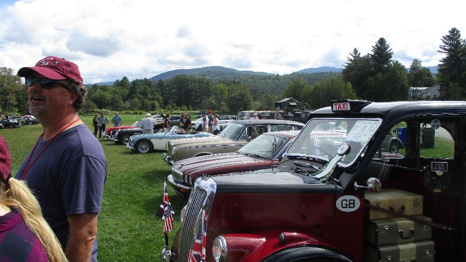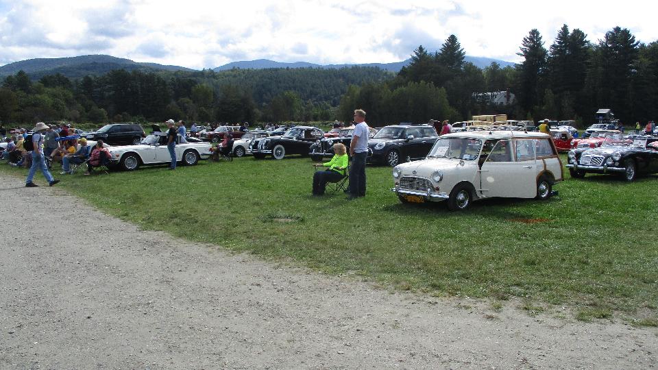 Up early, hit the road, another 60 miles or so, breakfast at McDonalds in Rutland, Vermont. Here we hooked up with fragments of Berkshire British Motor Club and Adirondack Triumph Association for a caravan north, intended to be about 82 miles to Stowe, Vermont for the British Invasion car show. Some cars arrived a bit late, some did not launch immediately with the caravan. They said to follow the Mini, but the Mini didn't move, so we ended up following an Elva Courier (the cream colored thing up front).