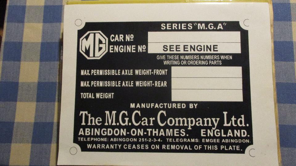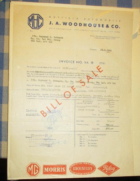 Ray has a very nice MGA 1600-MK-II "Deluxe" that he bought new in Germany in 1962 (more recently restored). He still has all of the original paperwork including bill of sale and the six original dealer documents that came with the car. The "Disc Brakes" option cost $125 at the time, which was 6% of the base sticker price of the car. Ray also has photographic art work needed to reproduce the German version of the Car No plate, with spaces to stamp front and rear axle weight and total gross vehicle weight.