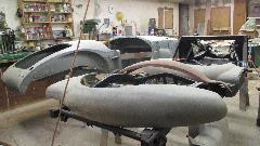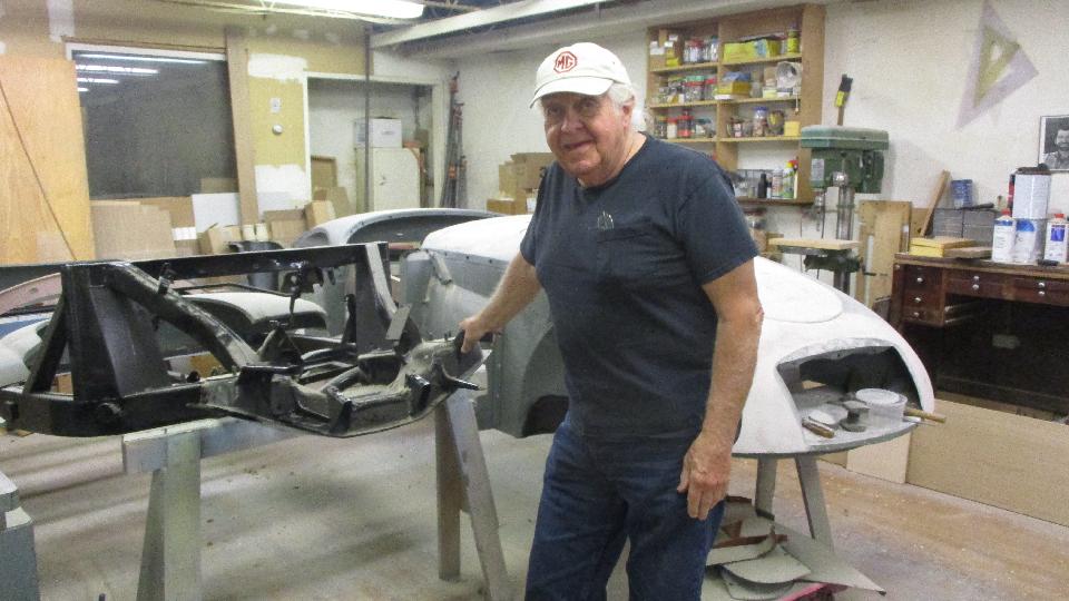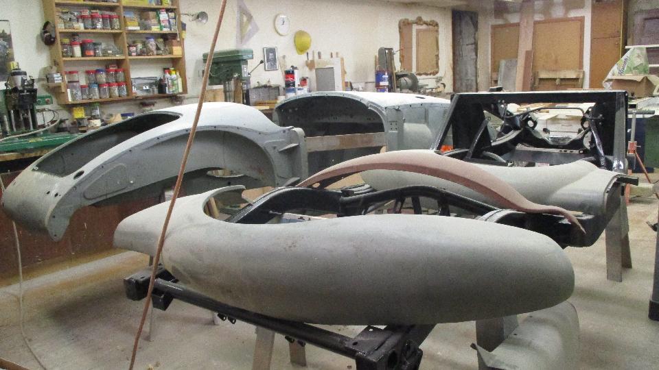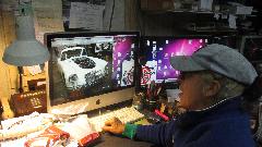 Out back some very useful parts cars and a few semi truck trailers for more storage, and another off-site warehouse for cars and more overflow parts. Love the wide screen (doube screen) computer. Notice the "proper red" leather for MGA seats and cockpit trim rolls.